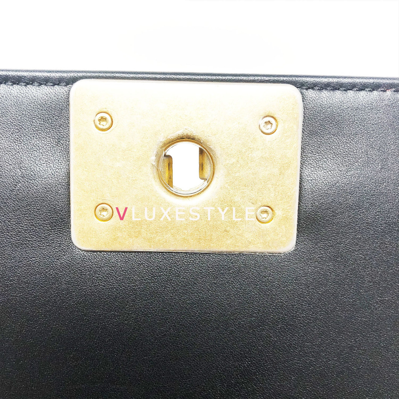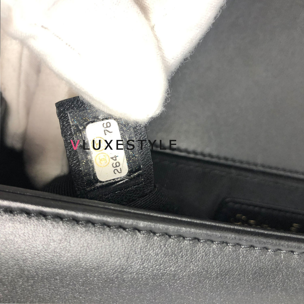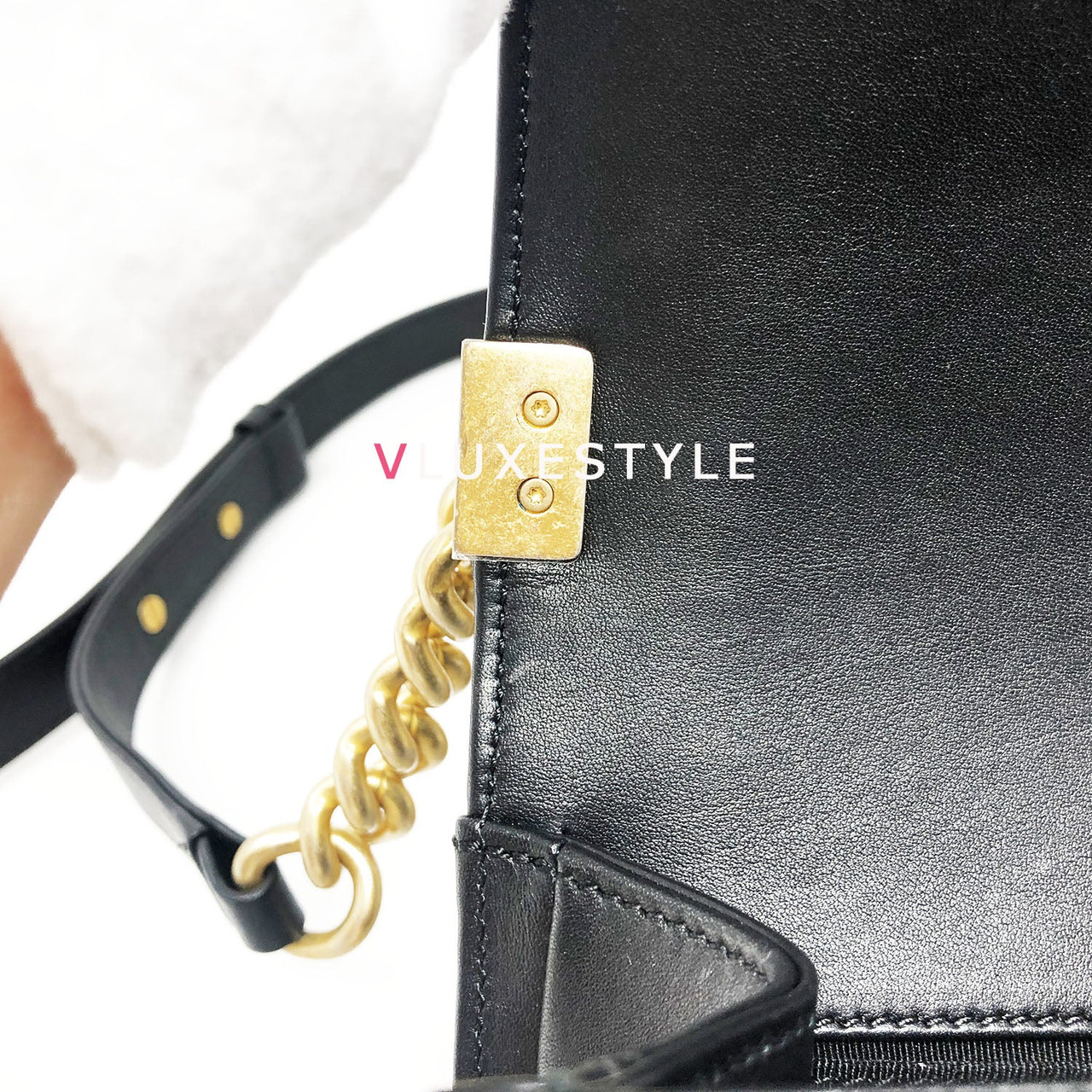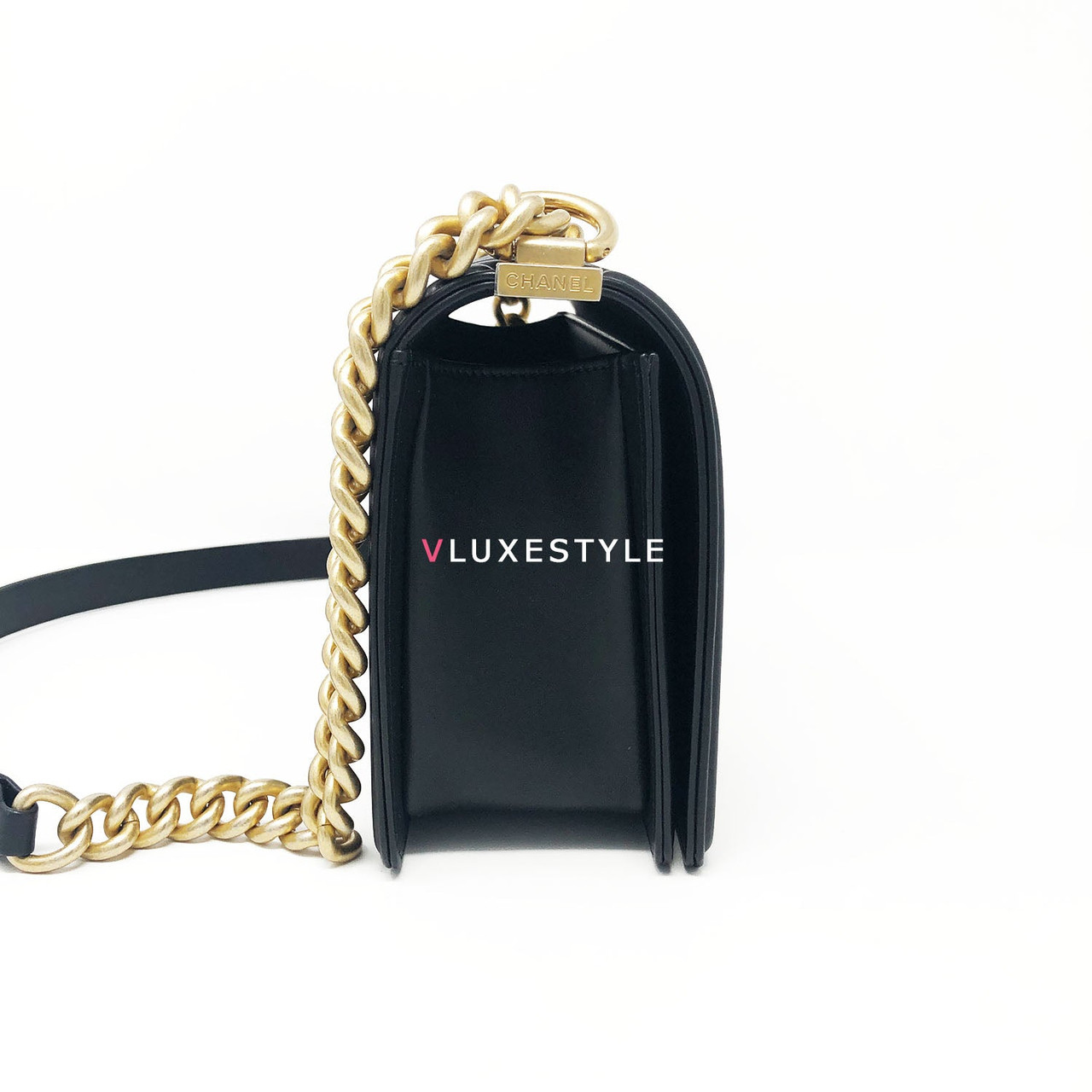 Authentic Chanel Le Boy Old Medium Black Quilted Calfskin with brushed gold hardware. This stylish shoulder bag is crafted of luxurious and durable quilted calfskin leather in black and brushed gold hardware. It's functional and versatile and features enough interior space to fit in all your essentials. The bag can be worn long and short over-the-shoulder bag and crossbody. It's the perfect bag for any occasion, wear it as a casual or formal bag.