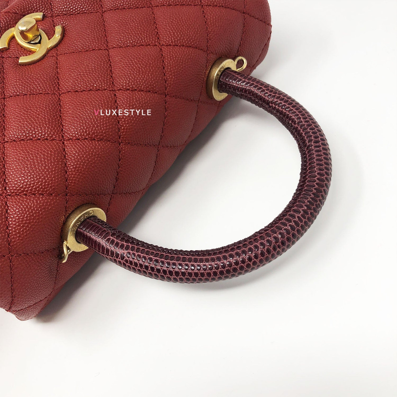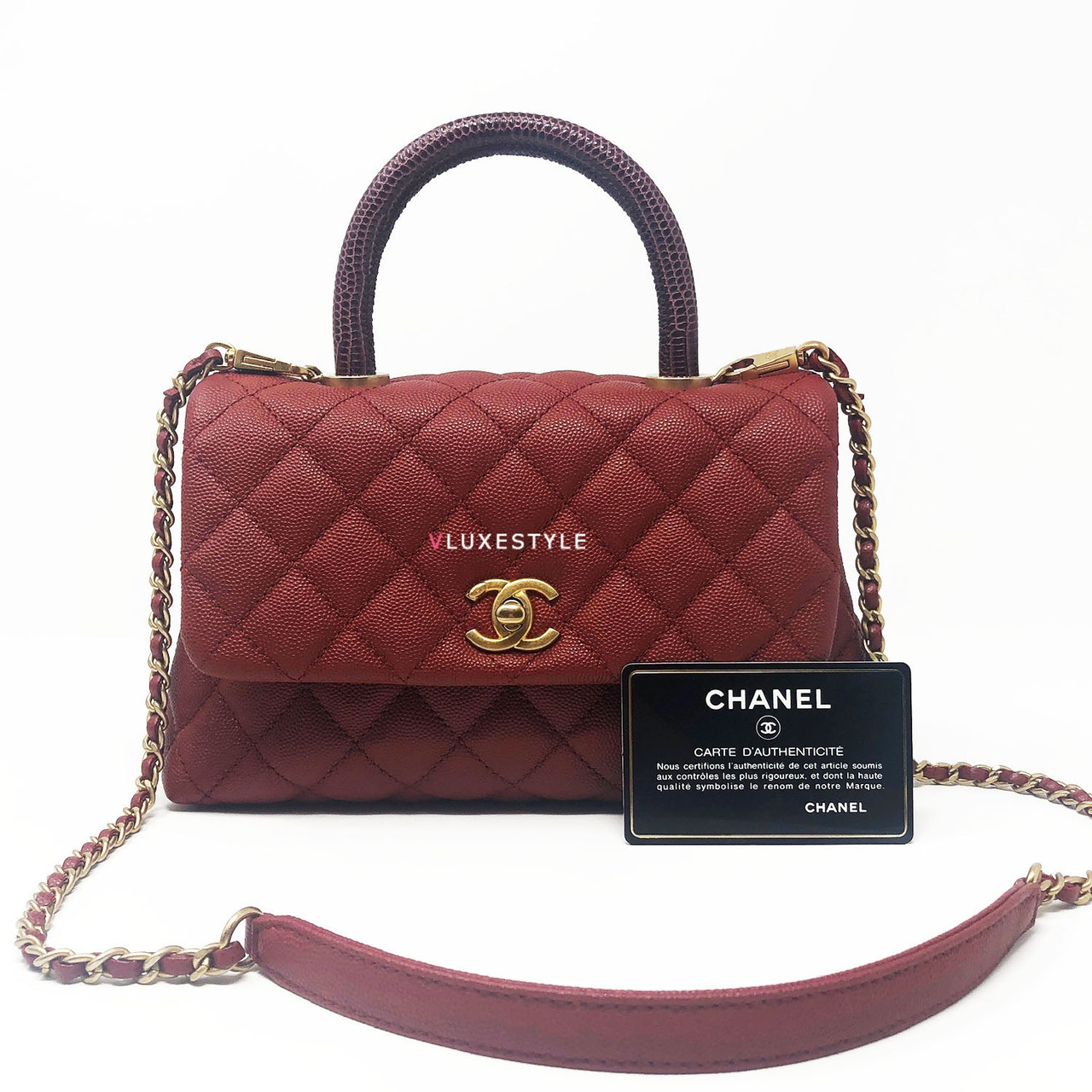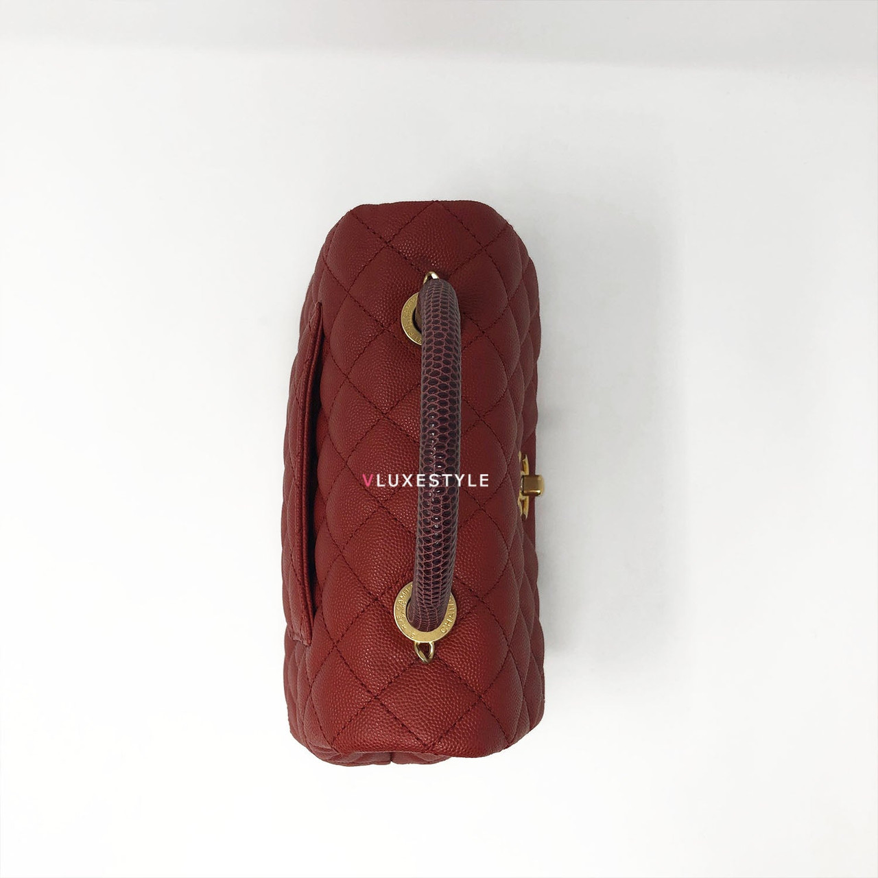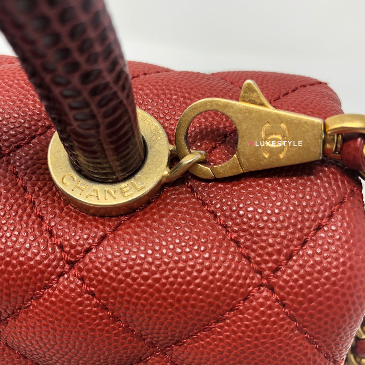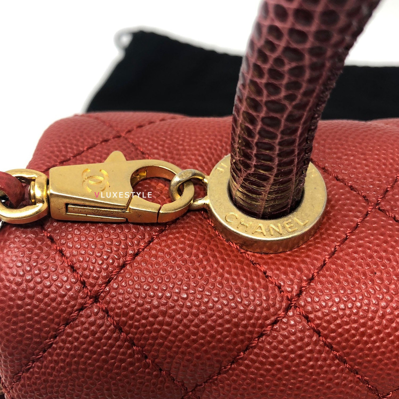 Very rare and hard to find! Authentic Chanel Mini Coco Red Quilted Caviar with Lizard handle and aged gold hardware. Absolutely stunning even more so in person. This stylish shoulder bag is crafted of luxurious and durable quilted caviar leather in red. The bag features a brown lizard handle and aged gold chain removable shoulder straps. Wear this bag handheld or over-the-shoulder. Last 2018 Chanel discontinued making exotics. If you've missed one, this is your chance to get this very rare combination.