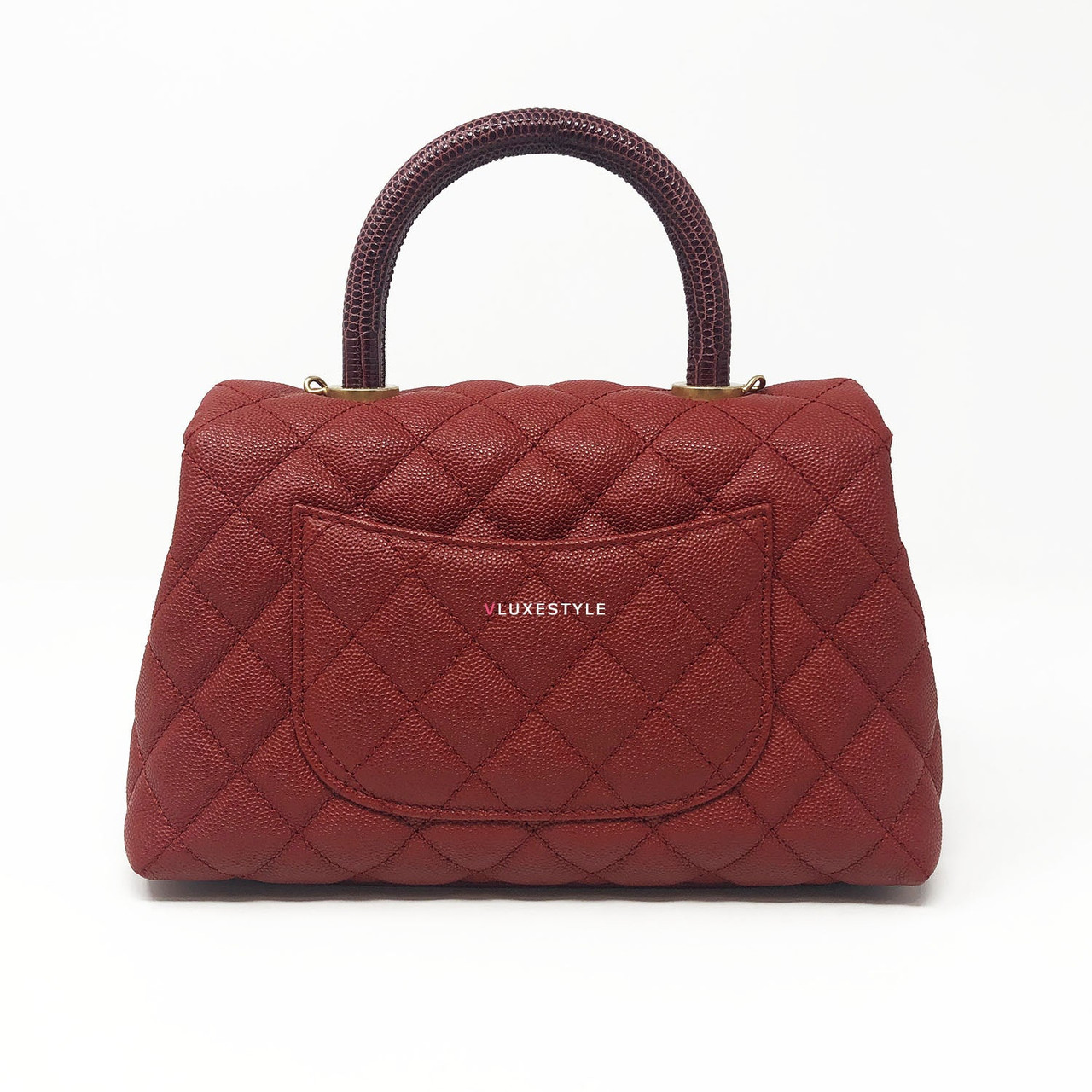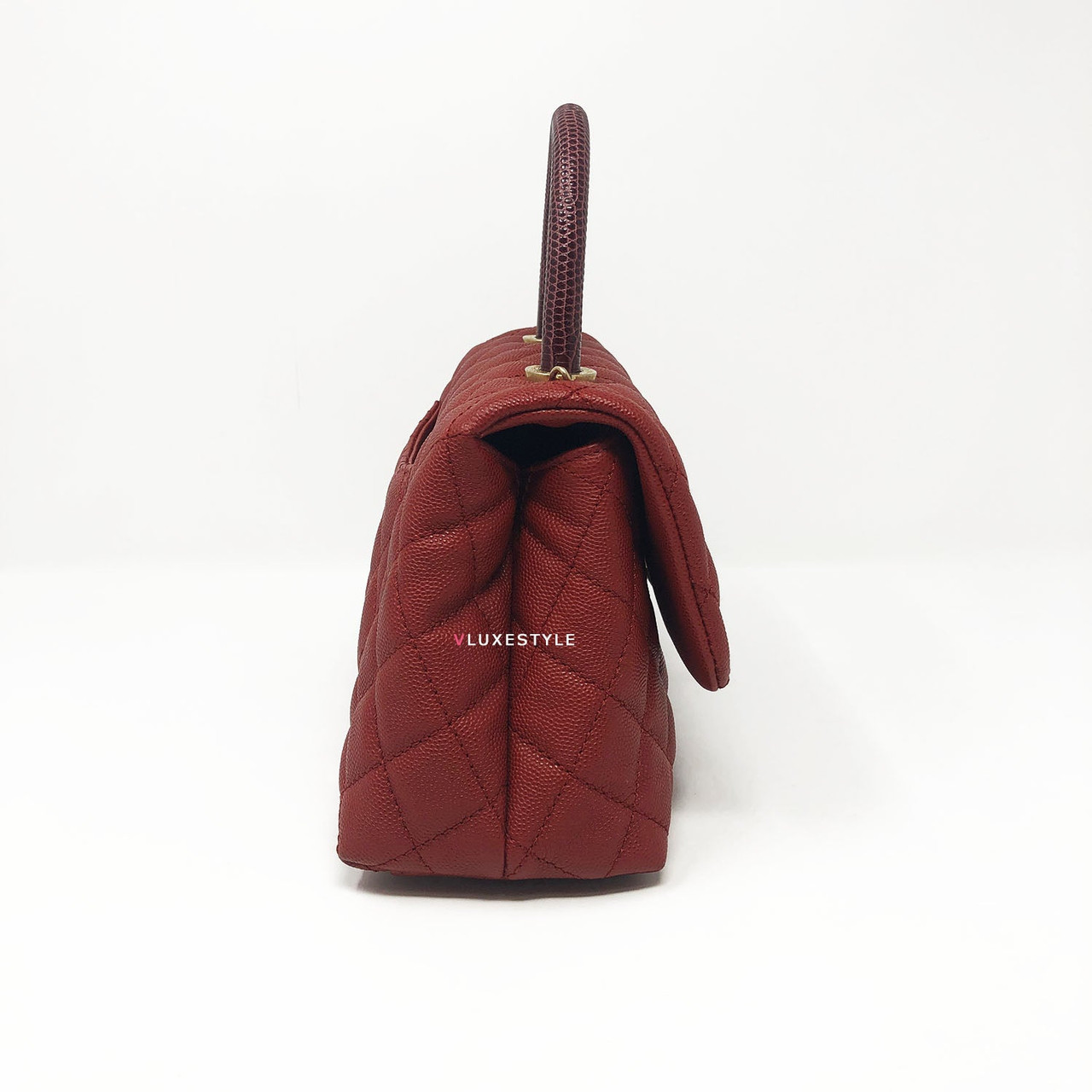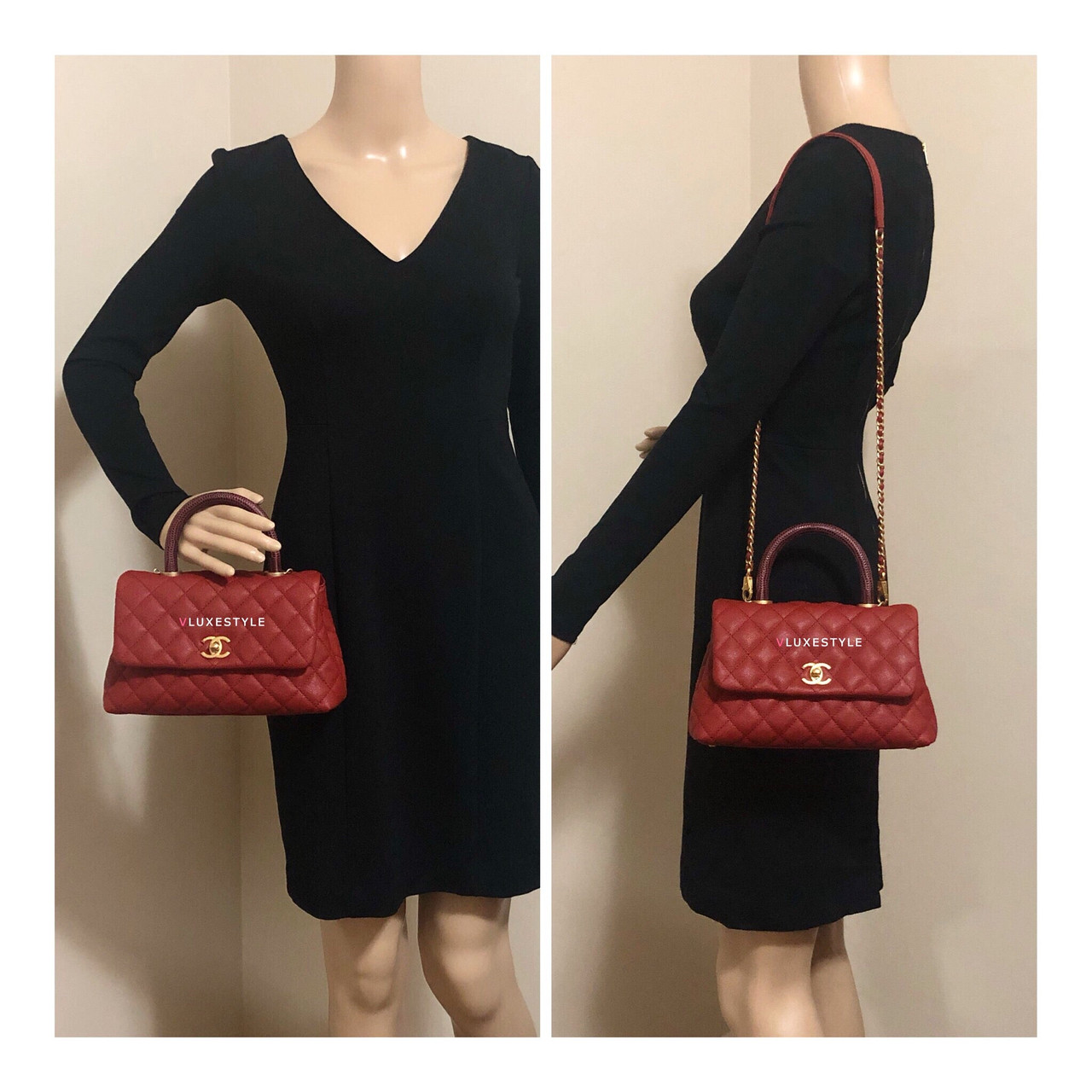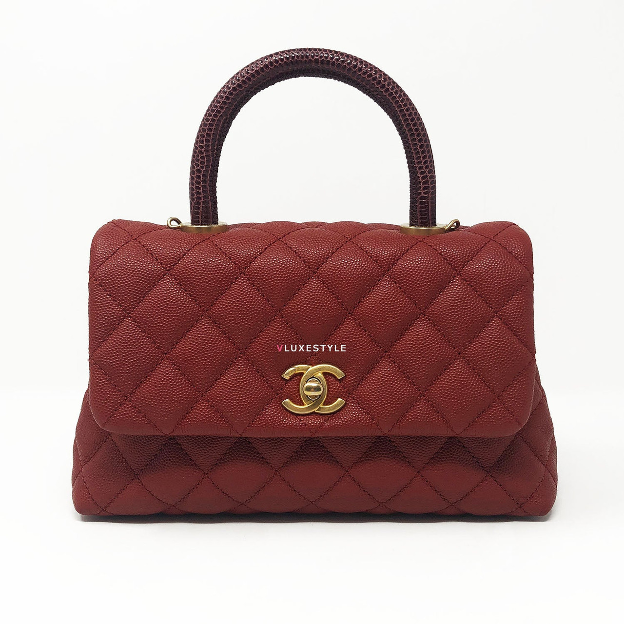 Very rare and hard to find! Authentic Chanel Mini Coco Red Quilted Caviar with Lizard handle and aged gold hardware. Absolutely stunning even more so in person. This stylish shoulder bag is crafted of luxurious and durable quilted caviar leather in red. The bag features a brown lizard handle and aged gold chain removable shoulder straps. Wear this bag handheld or over-the-shoulder. Last 2018 Chanel discontinued making exotics. If you've missed one, this is your chance to get this very rare combination.