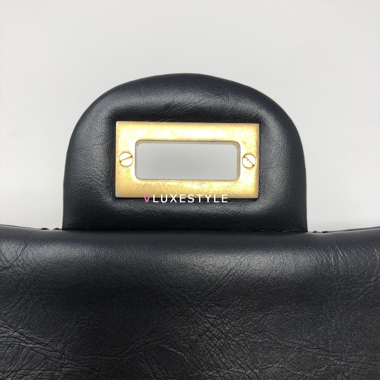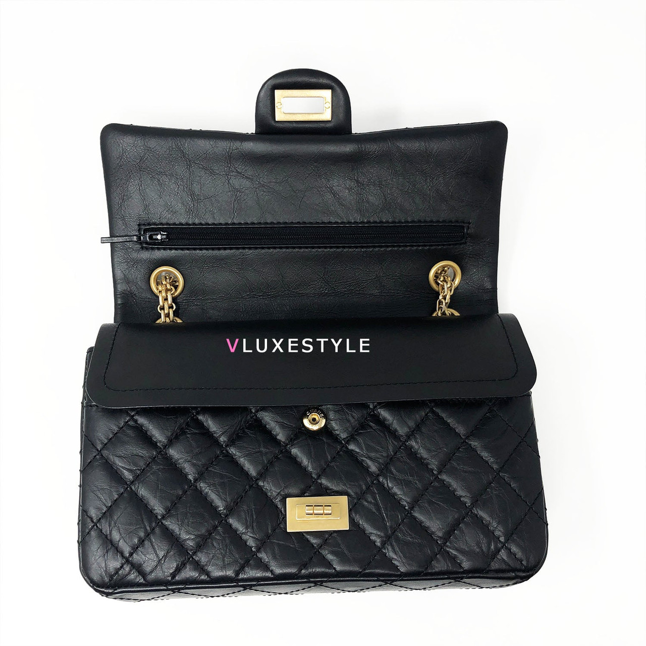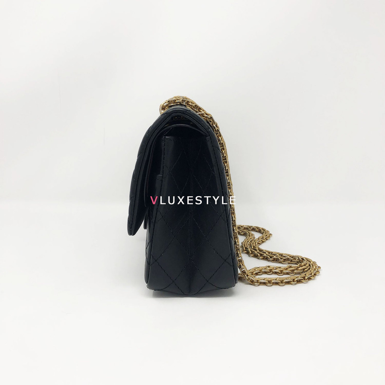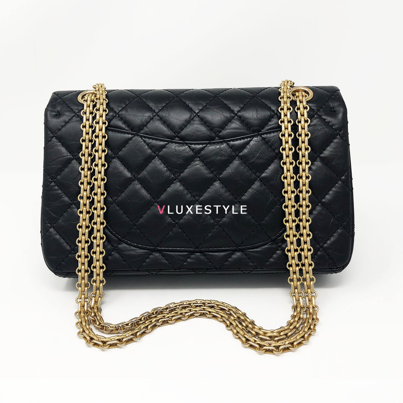 Highly sought-after and very difficult to find this size and combo. Authentic Chanel Reissue 2.55 Black Quilted Aged Calfskin Double Flap with aged gold hardware in size 225. This stylish shoulder bag is crafted of luxurious and durable quilted aged calfskin leather in black. The bag features a mademoiselle turn-lock closure and bijoux aged gold hardware shoulder chains. The bag can be worn long and short over-the-shoulder or wear it as a cross-body. An elegant, understated, timeless piece perfect for every occasion.