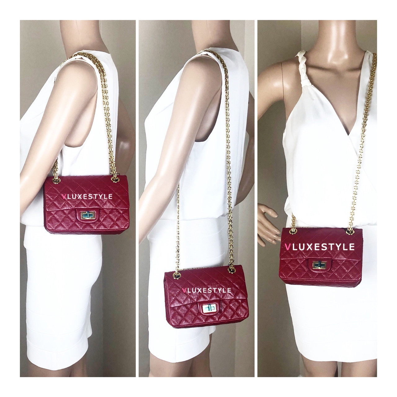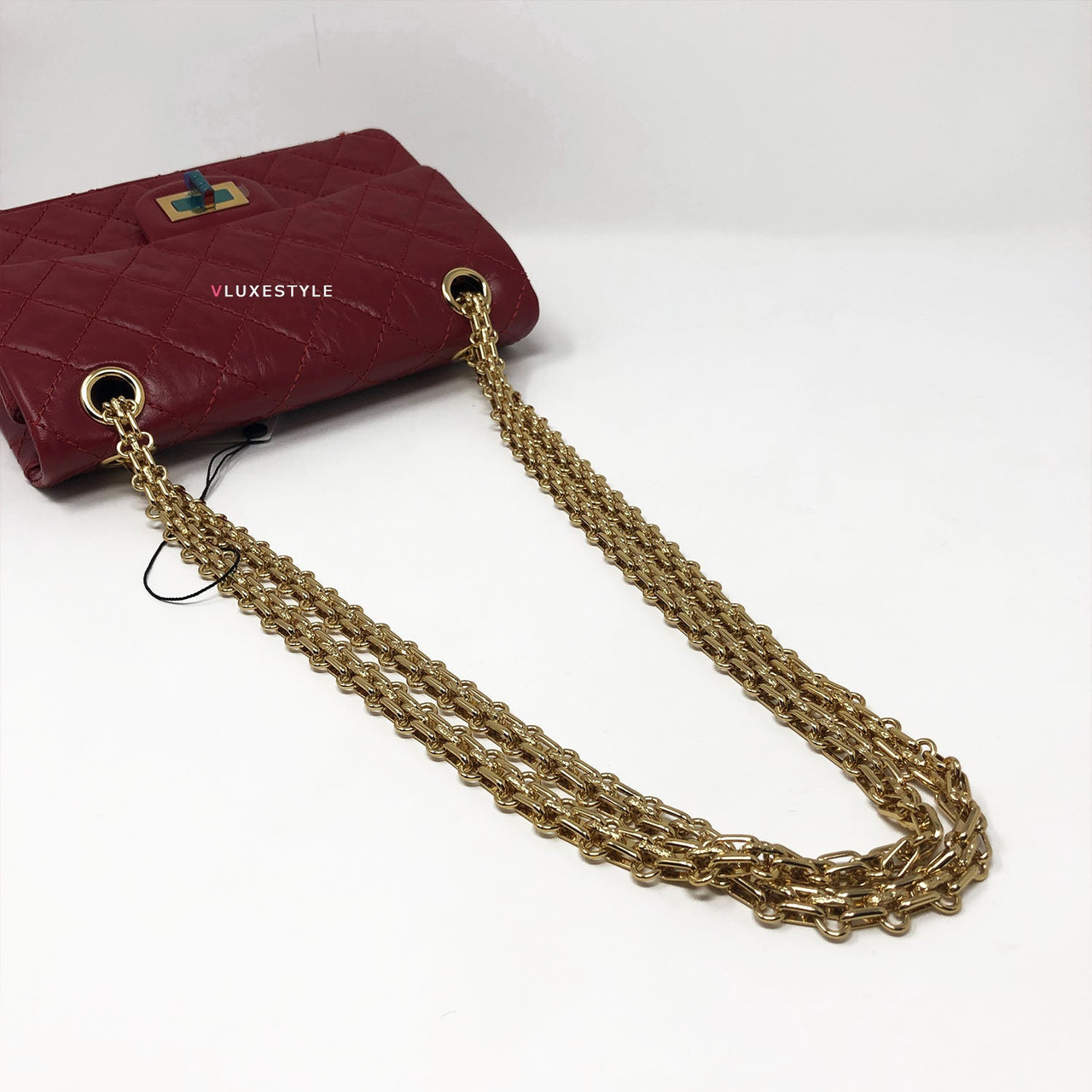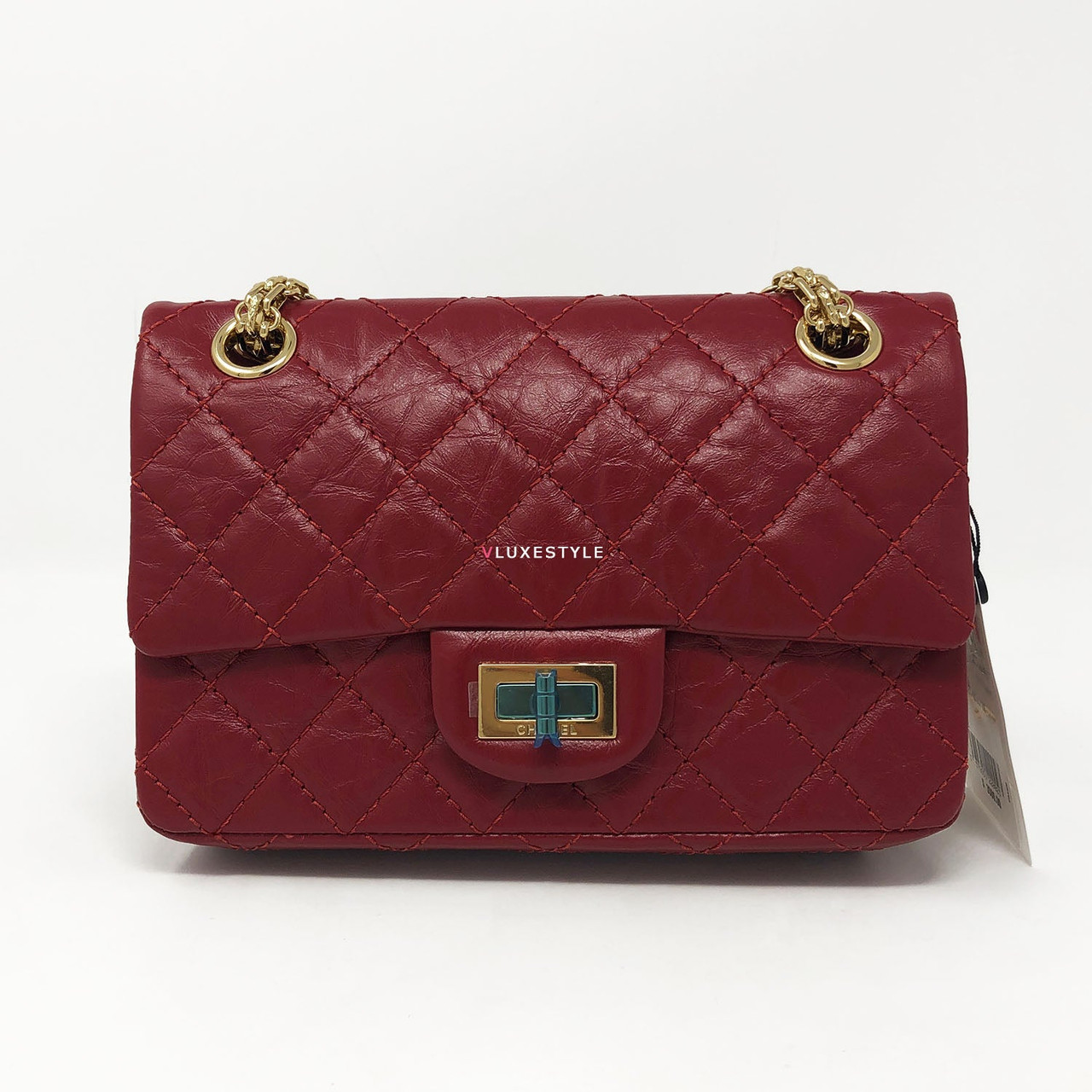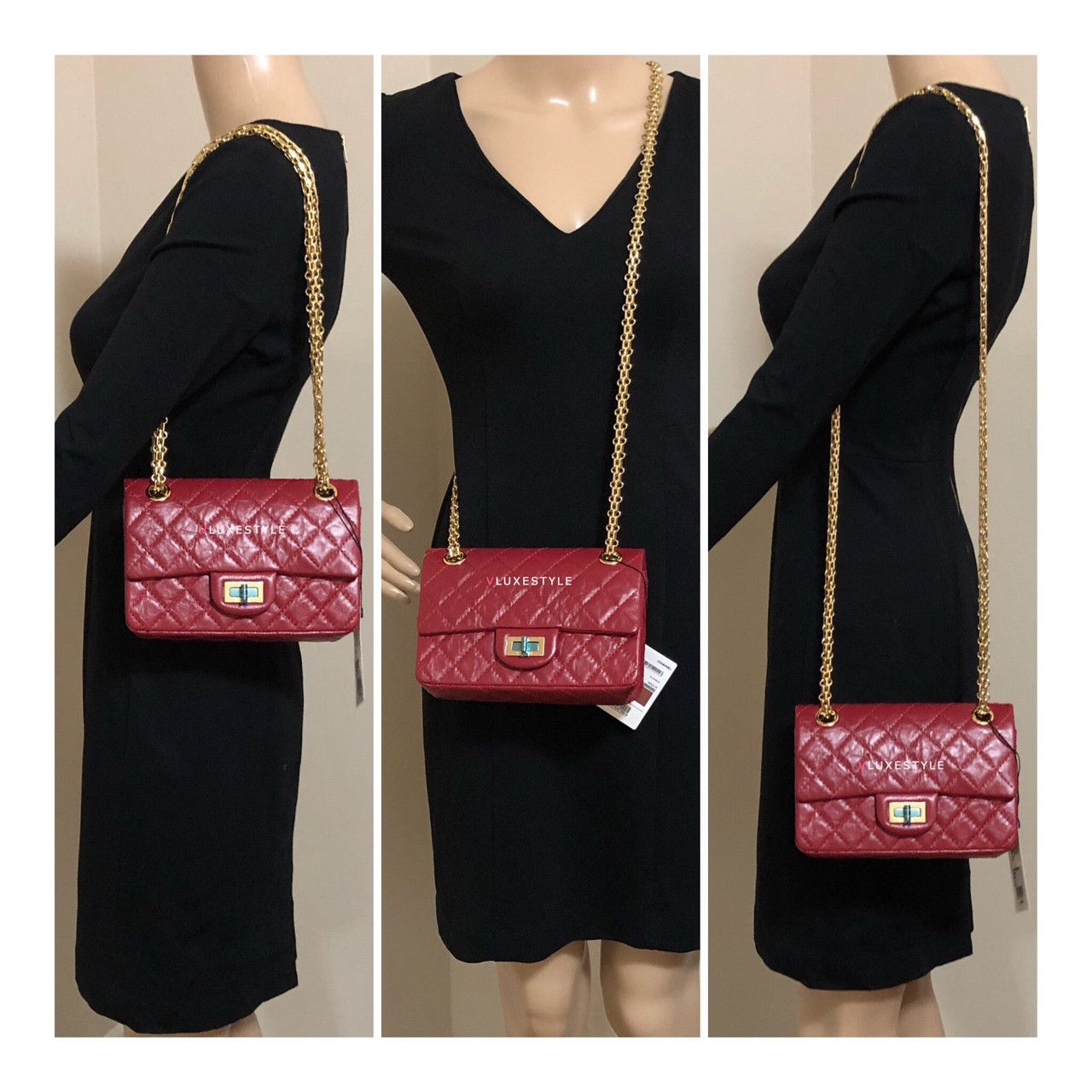 This stylish shoulder bag is crafted of luxurious and durable aged calfskin leather in red and shiny gold hardware. The mini size is the same size as the Reissue 224. The bag features a mademoiselle turn lock closure and bijoux aged gold hardware shoulder chains and it comes with 4-grommets, you can change from cross body to double chain shoulder bag or to single chain shoulder bag easily. An elegant, understated, timeless piece perfect for every occasion.