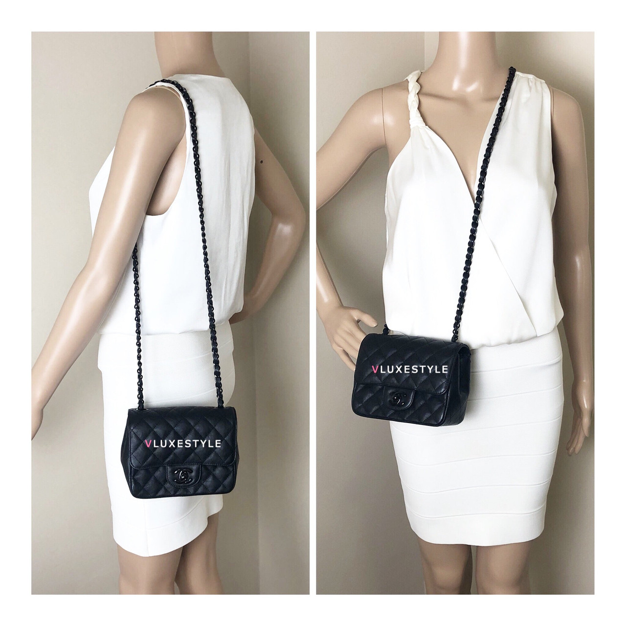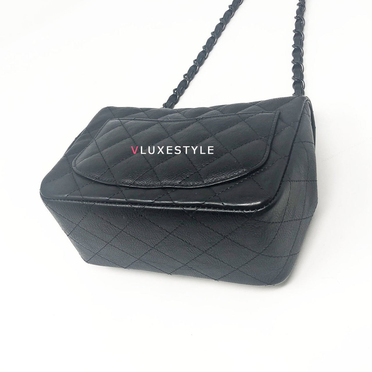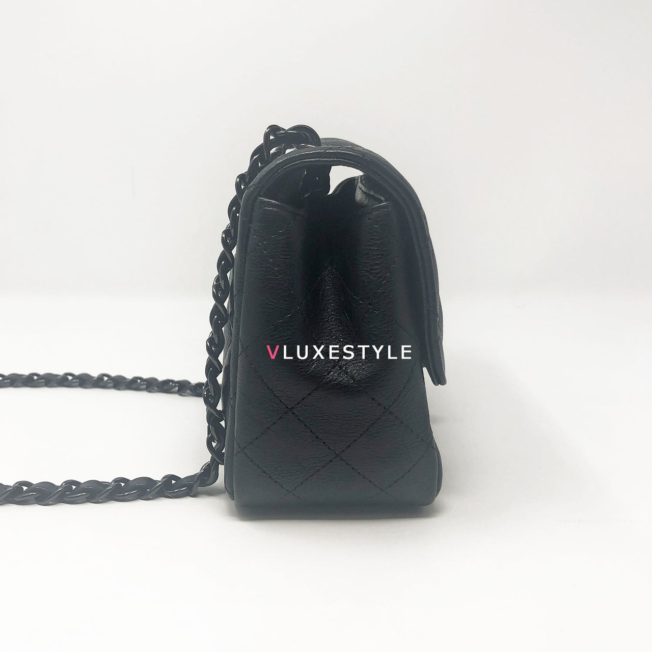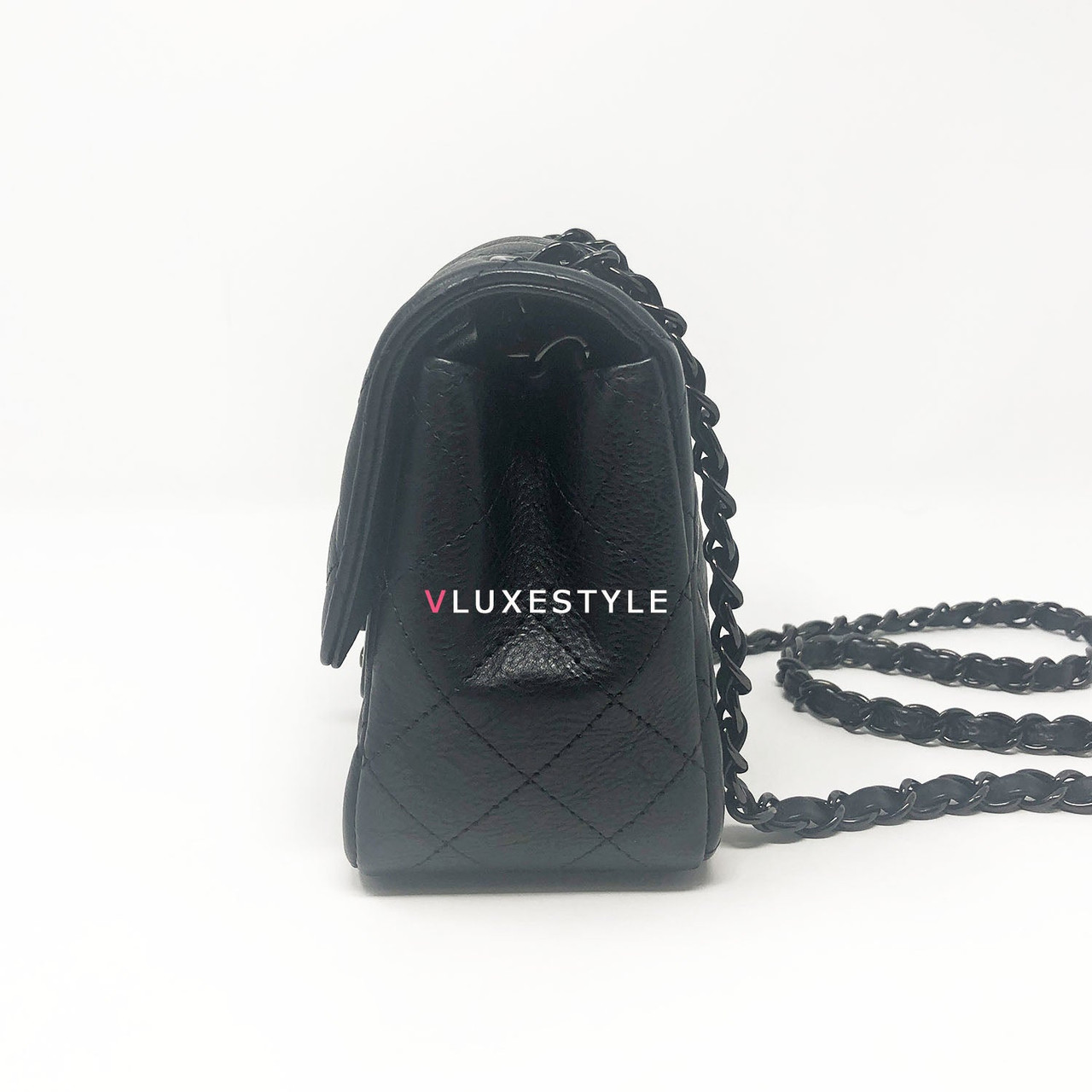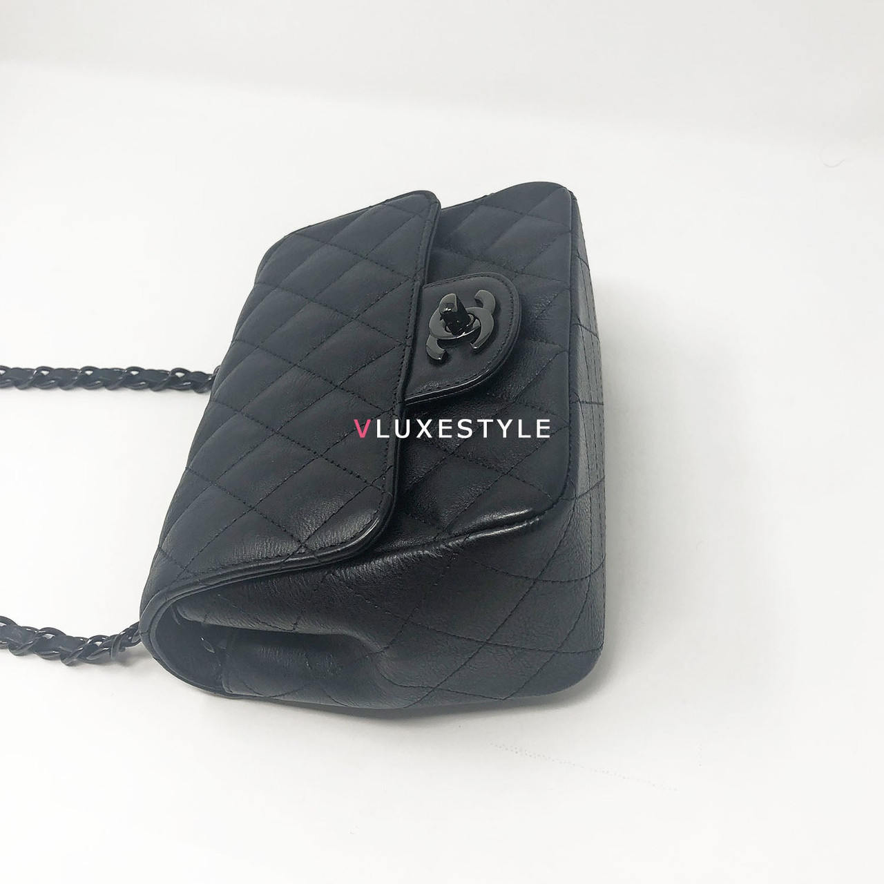 Authentic Chanel 17S So Black Mini Square Crumpled Quilted Calfskin with shiny black hardware. The most coveted and rare combination of leather and hardware and its only limited availability in certain seasons. This chic mini bag is crafted of durable calfskin leather in black with shiny black hardware. The bag can be worn as a cross-body or over-the-shoulder bag.