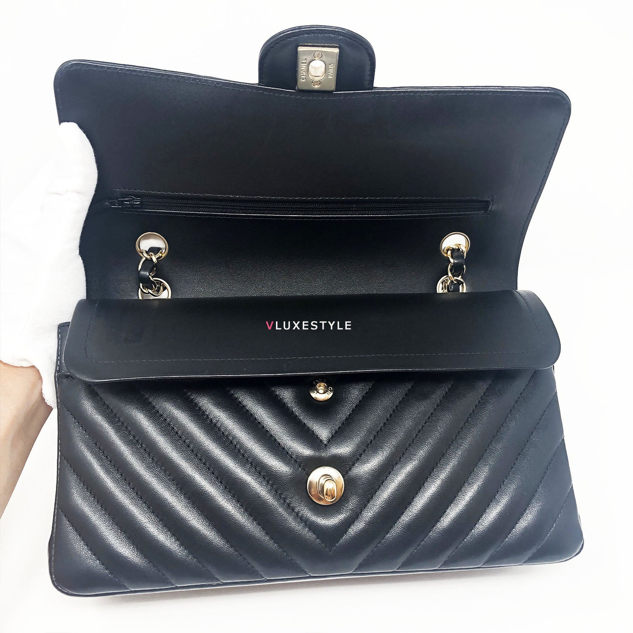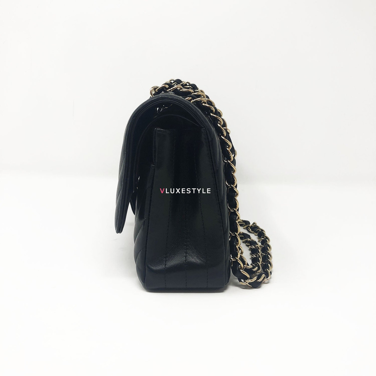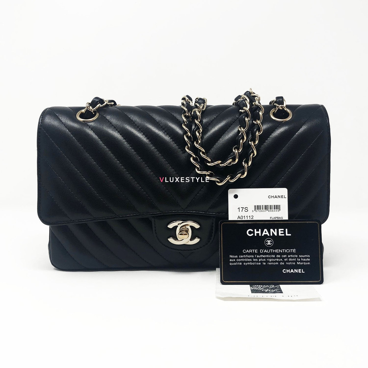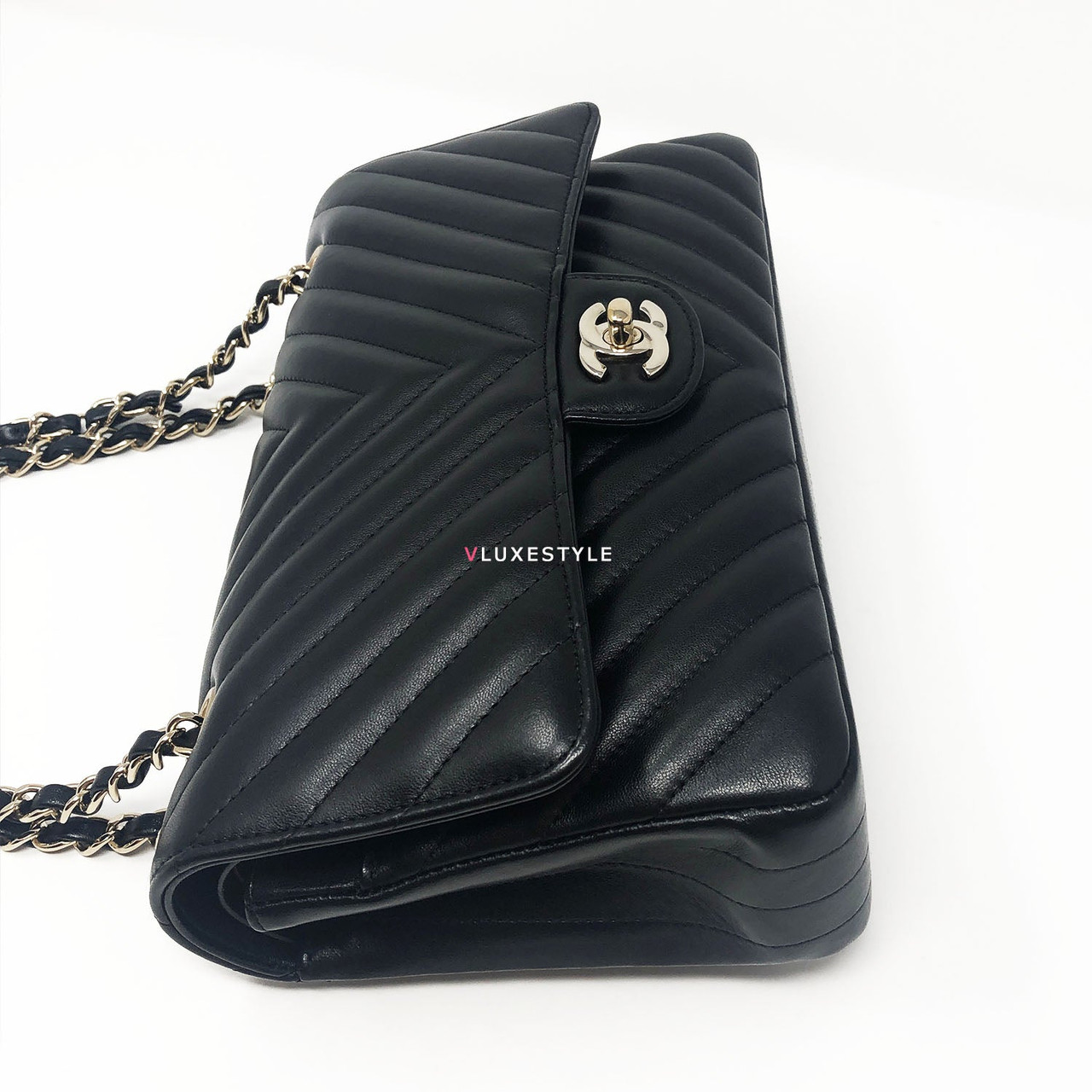Rare find! Authentic Chanel 17S Classic Medium Double Flap Black Chevron Lambskin with light gold hardware. This timeless and stylish shoulder bag is crafted of luxurious lambskin leather in black in an ultra-rare chevron pattern and light gold hardware. The bag can be worn long and short over-the-shoulder. It is essentially a timeless piece that exudes elegance, its the perfect bag for every occasion.