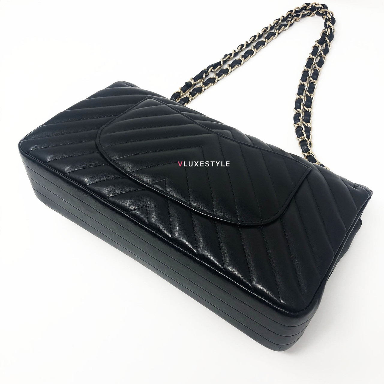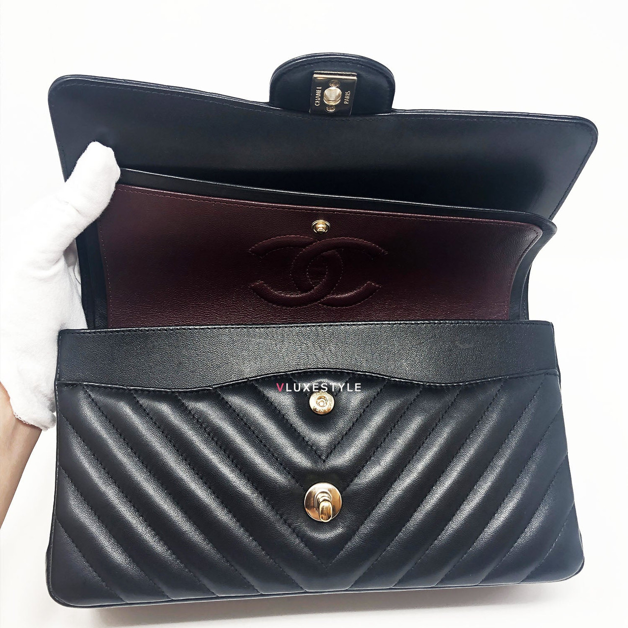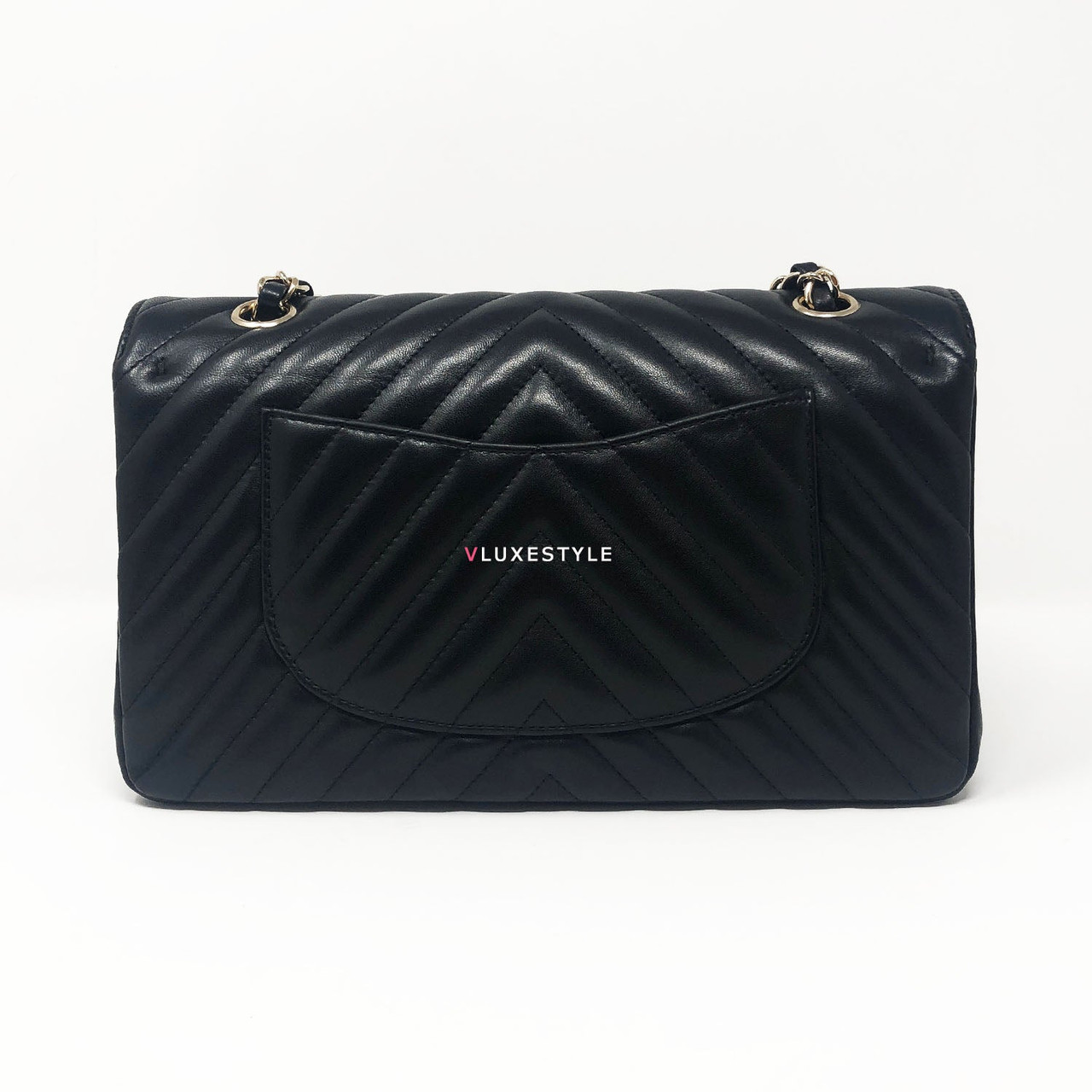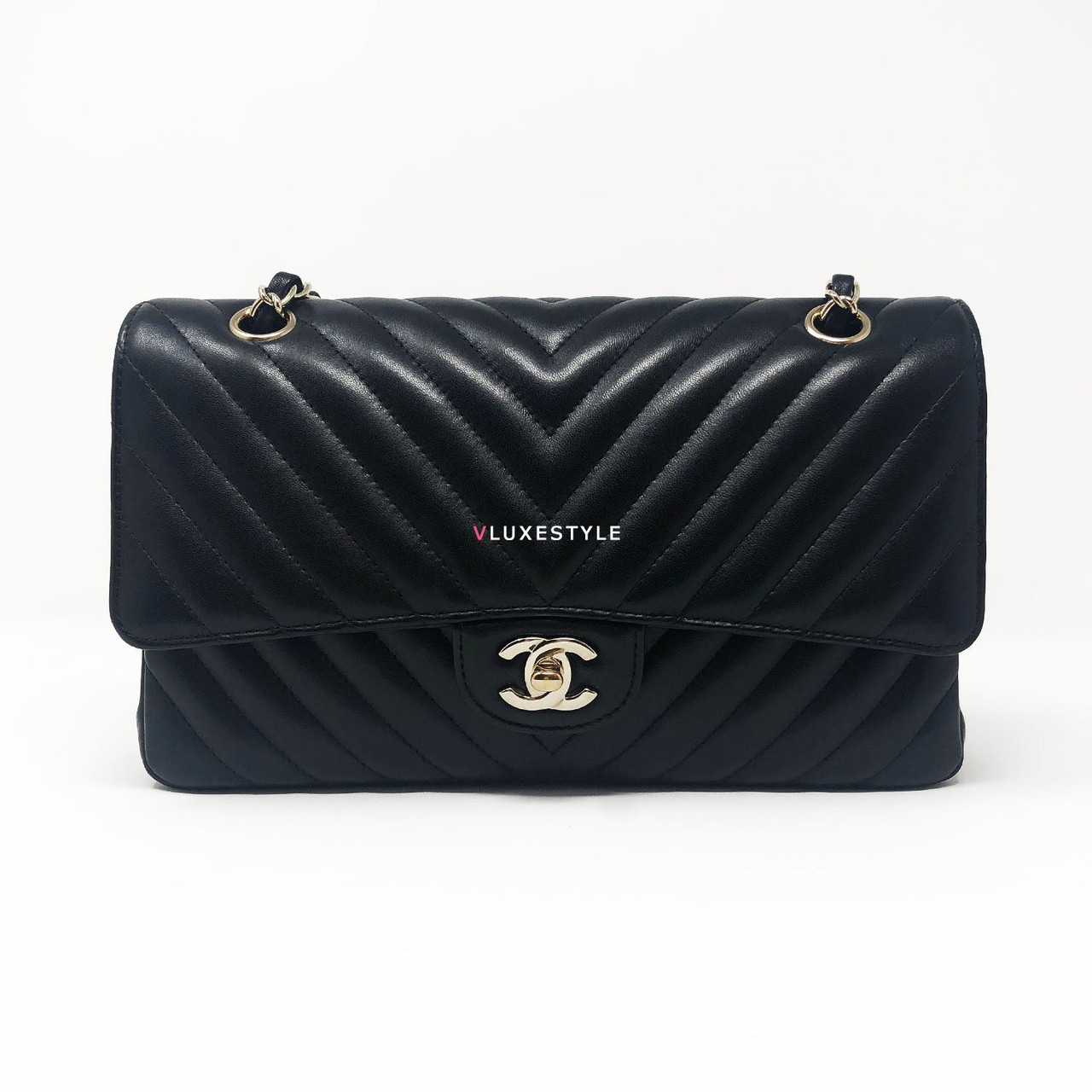 Rare find! Authentic Chanel 17S Classic Medium Double Flap Black Chevron Lambskin with light gold hardware. This timeless and stylish shoulder bag is crafted of luxurious lambskin leather in black in an ultra-rare chevron pattern and light gold hardware. The bag can be worn long and short over-the-shoulder. It is essentially a timeless piece that exudes elegance, its the perfect bag for every occasion.