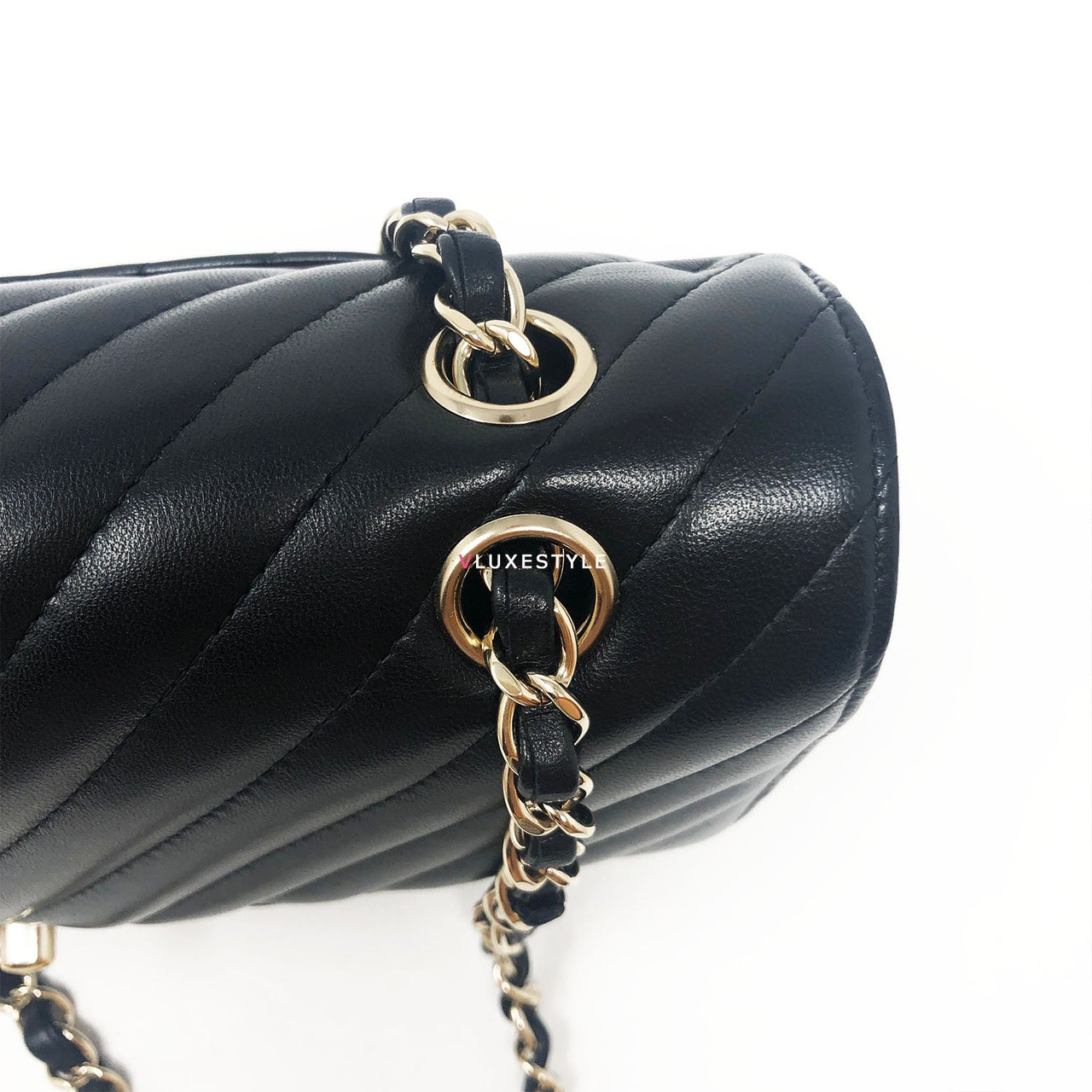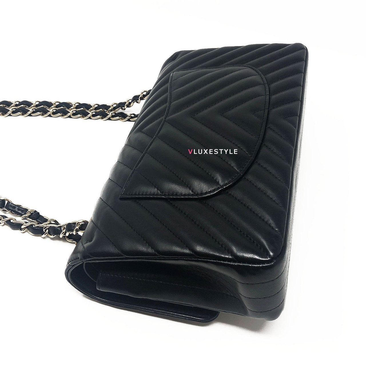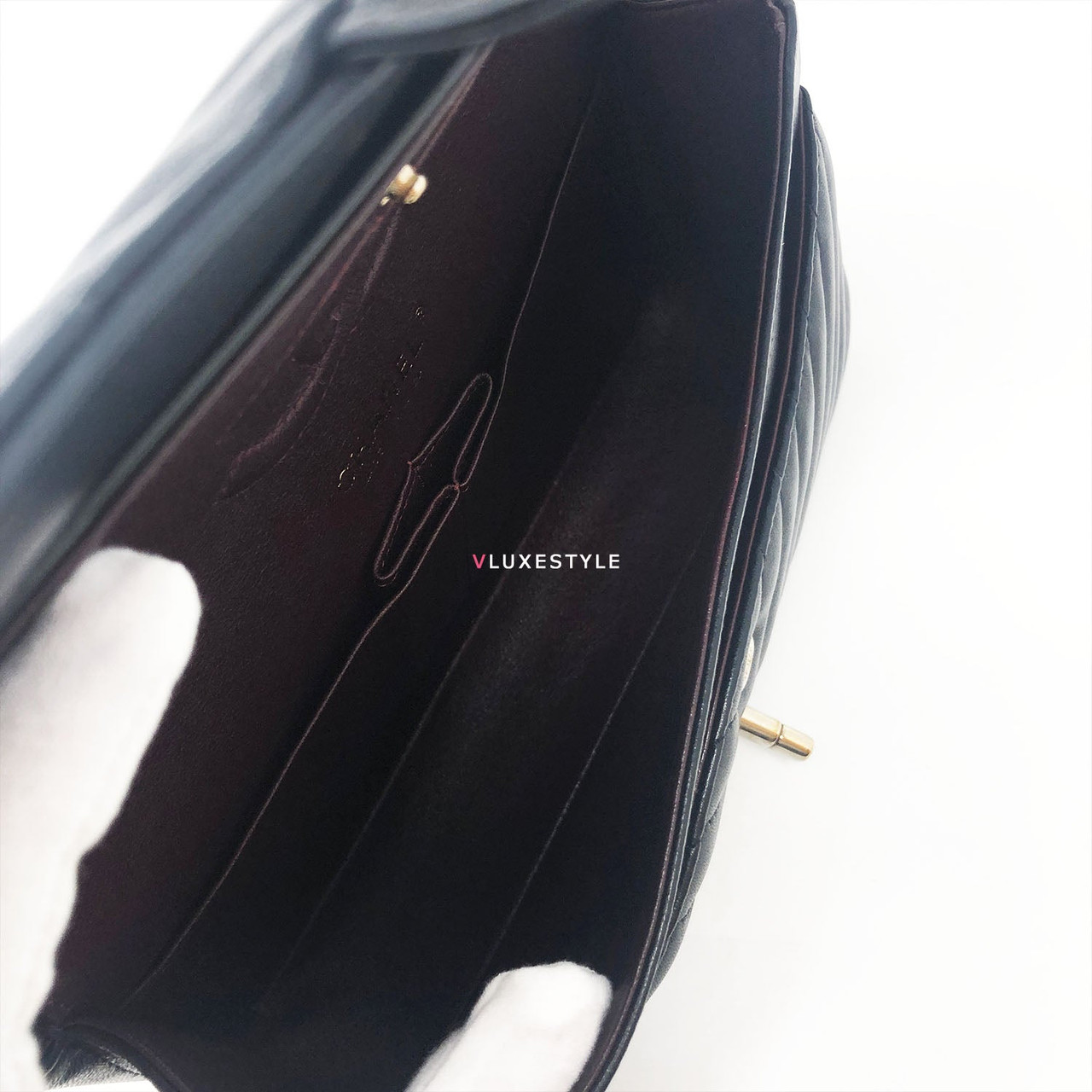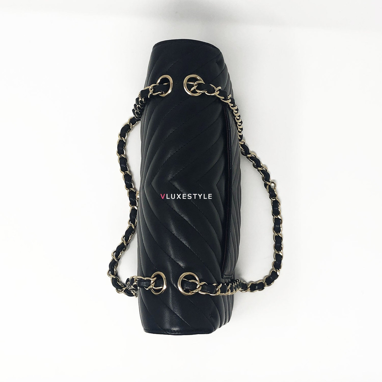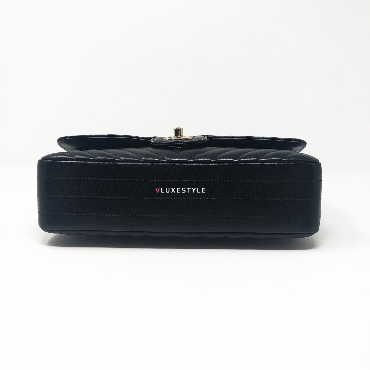 Rare find! Authentic Chanel 17S Classic Medium Double Flap Black Chevron Lambskin with light gold hardware. This timeless and stylish shoulder bag is crafted of luxurious lambskin leather in black in an ultra-rare chevron pattern and light gold hardware. The bag can be worn long and short over-the-shoulder. It is essentially a timeless piece that exudes elegance, its the perfect bag for every occasion.