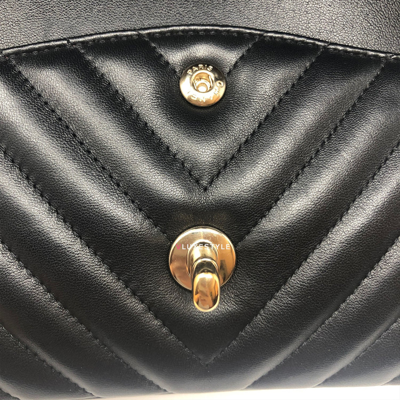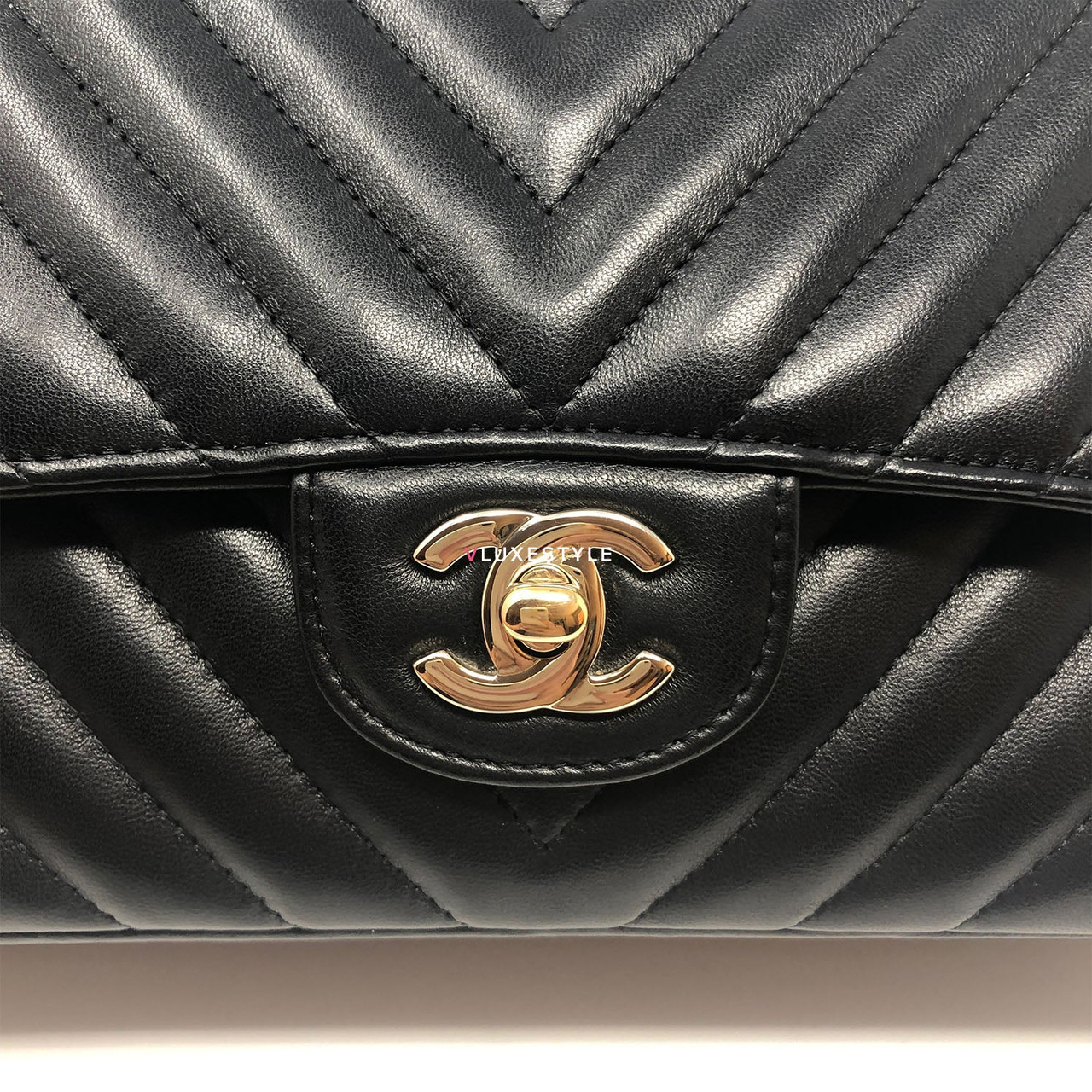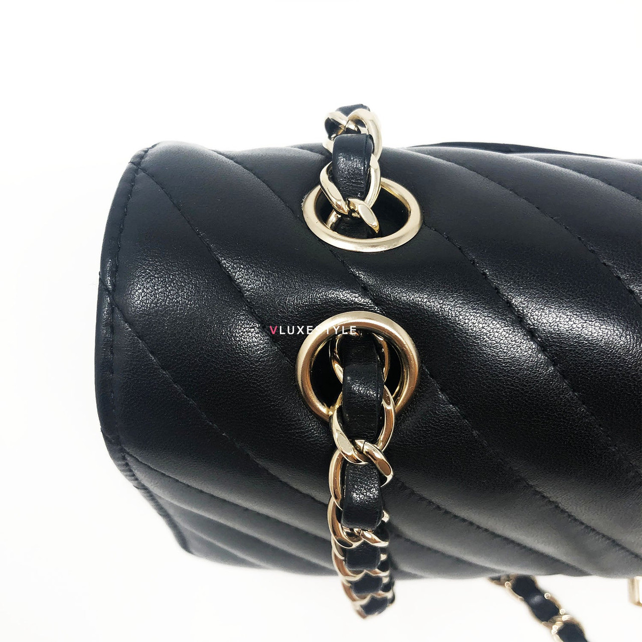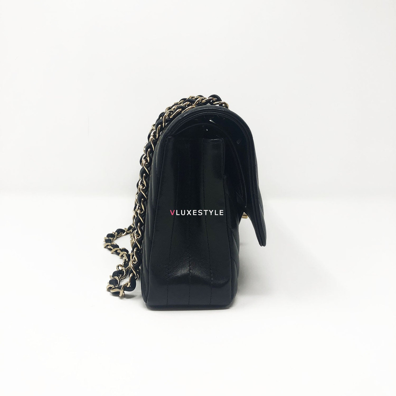 Rare find! Authentic Chanel 17S Classic Medium Double Flap Black Chevron Lambskin with light gold hardware. This timeless and stylish shoulder bag is crafted of luxurious lambskin leather in black in an ultra-rare chevron pattern and light gold hardware. The bag can be worn long and short over-the-shoulder. It is essentially a timeless piece that exudes elegance, its the perfect bag for every occasion.