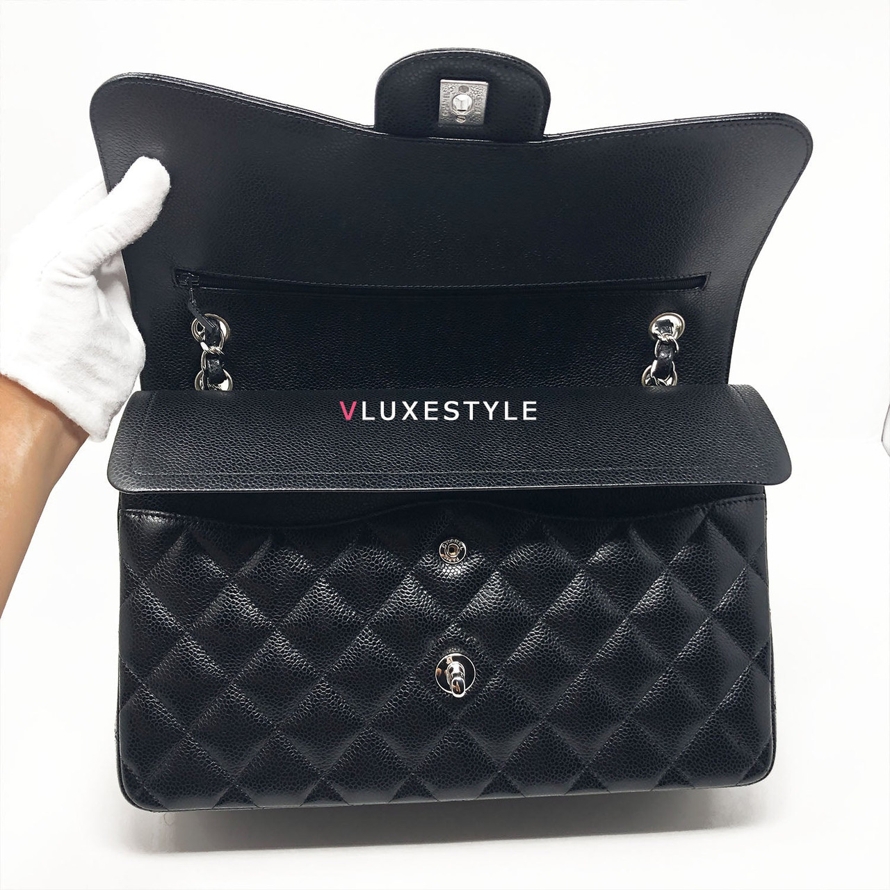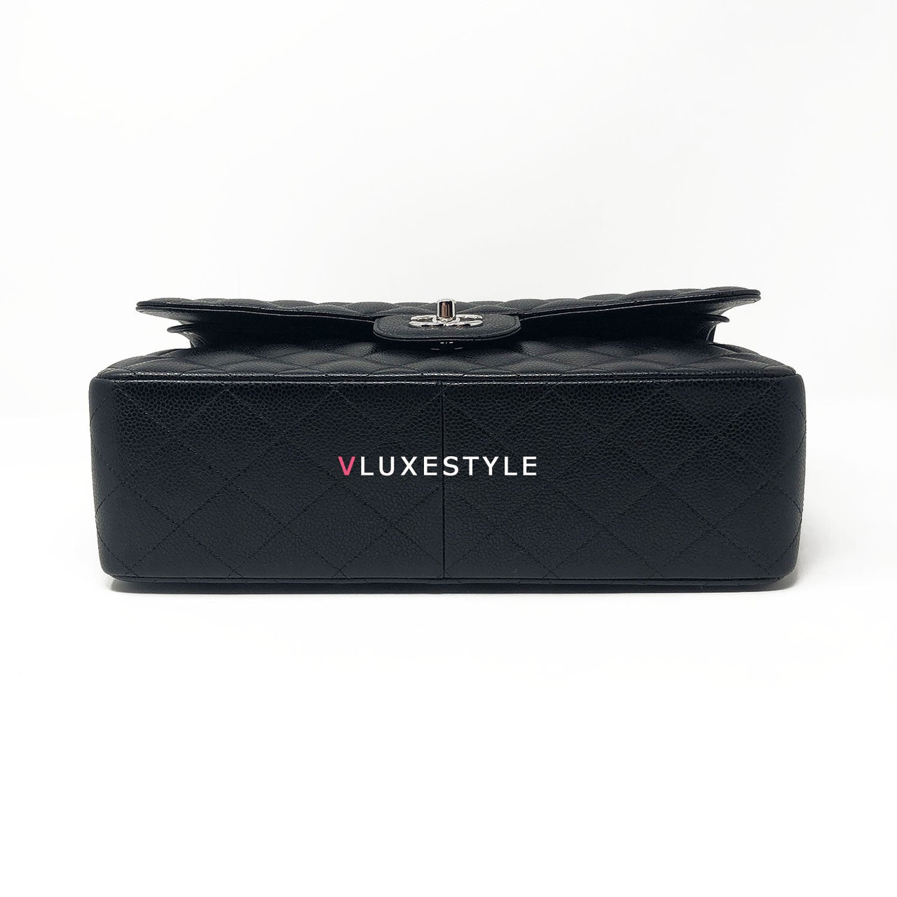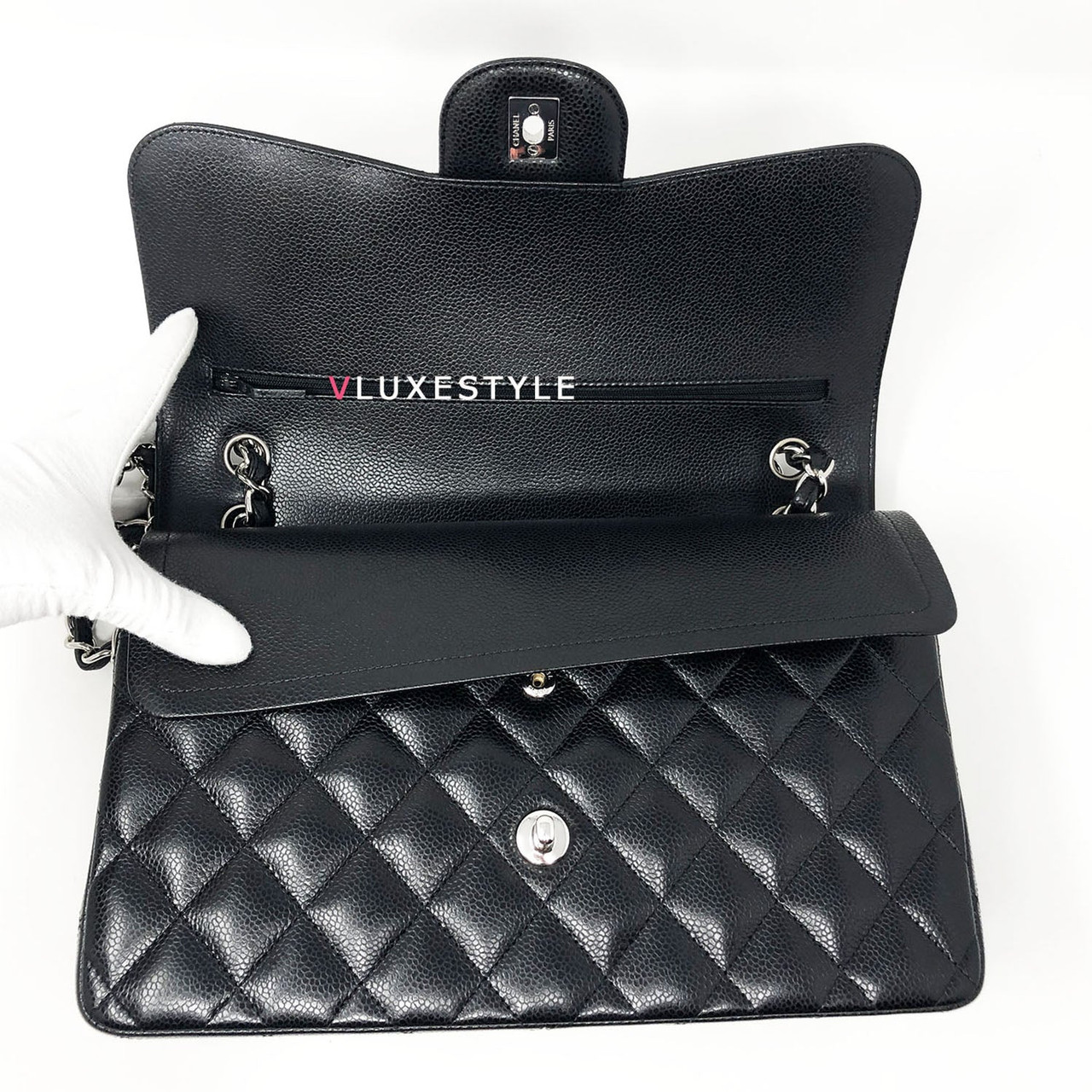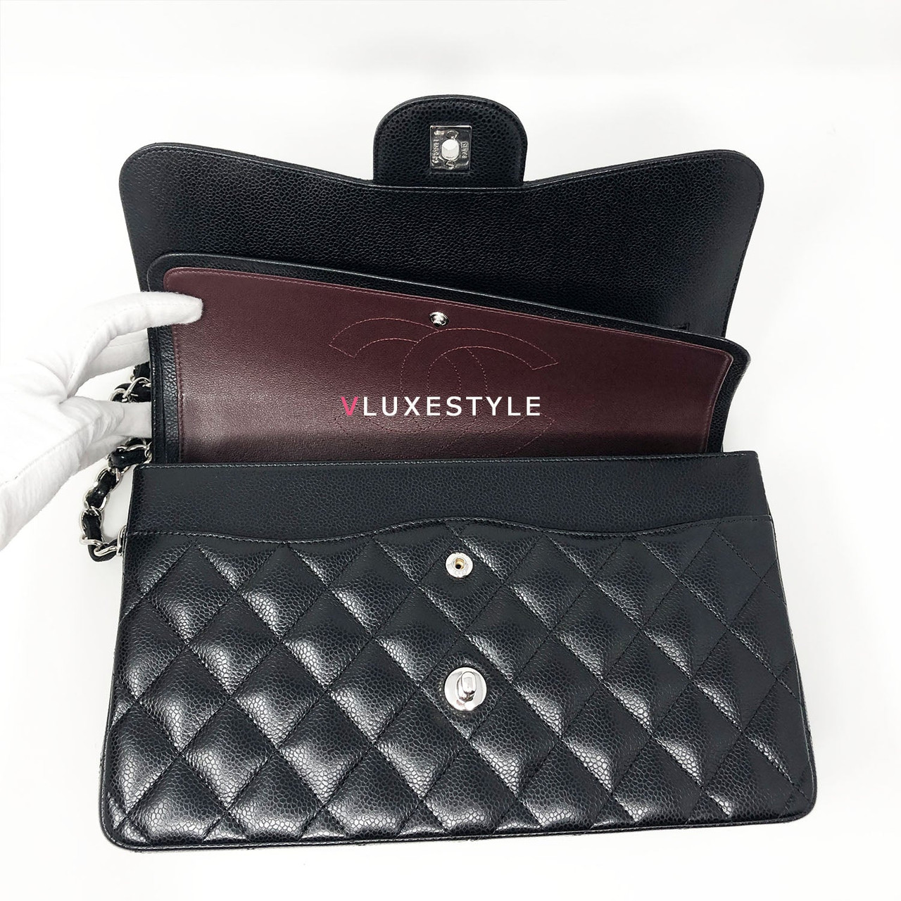 Authentic Chanel Classic Jumbo Black Quilted Caviar Double Flap with silver hardware. This timeless and stylish shoulder bag is crafted of luxurious and durable caviar leather in black and silver hardware. The bag can be worn over-the-shoulder. It is essentially a timeless piece that exudes elegance, it’s the perfect bag for every occasion.