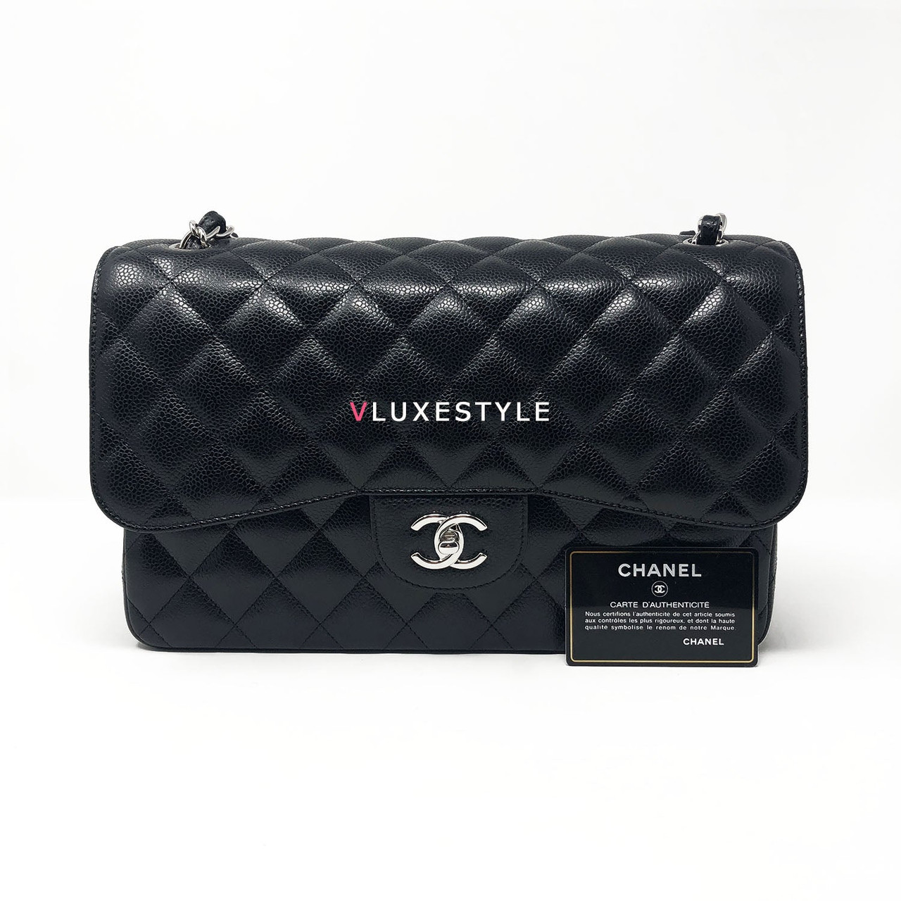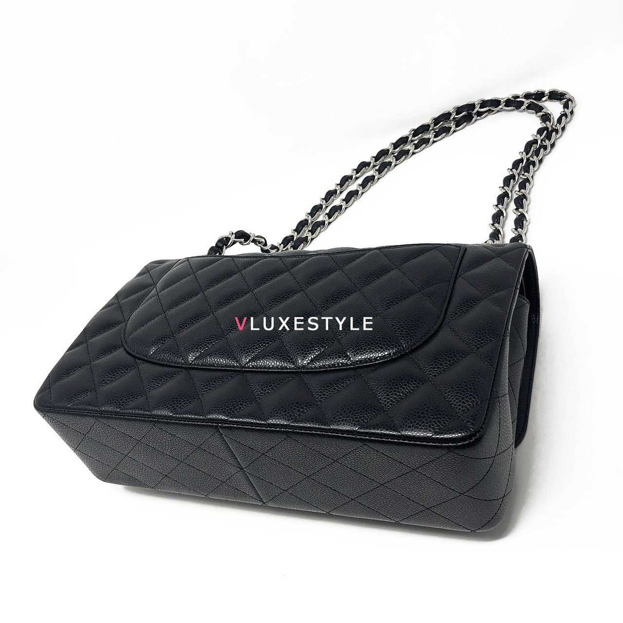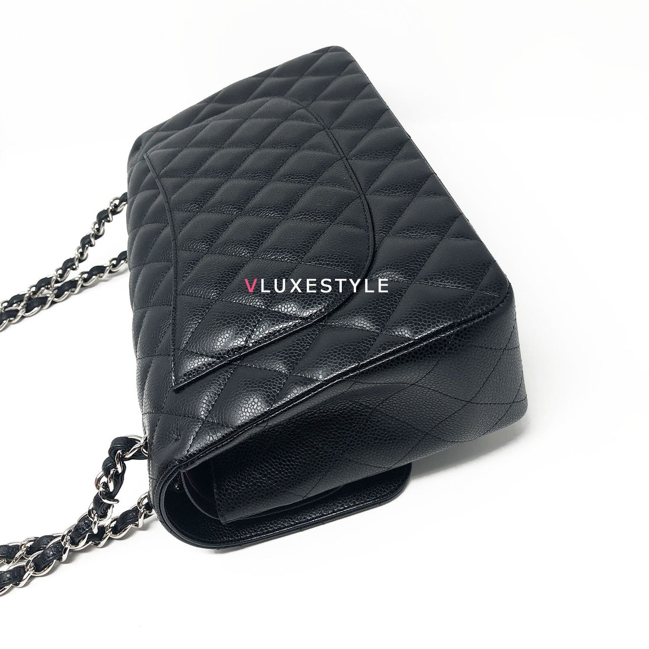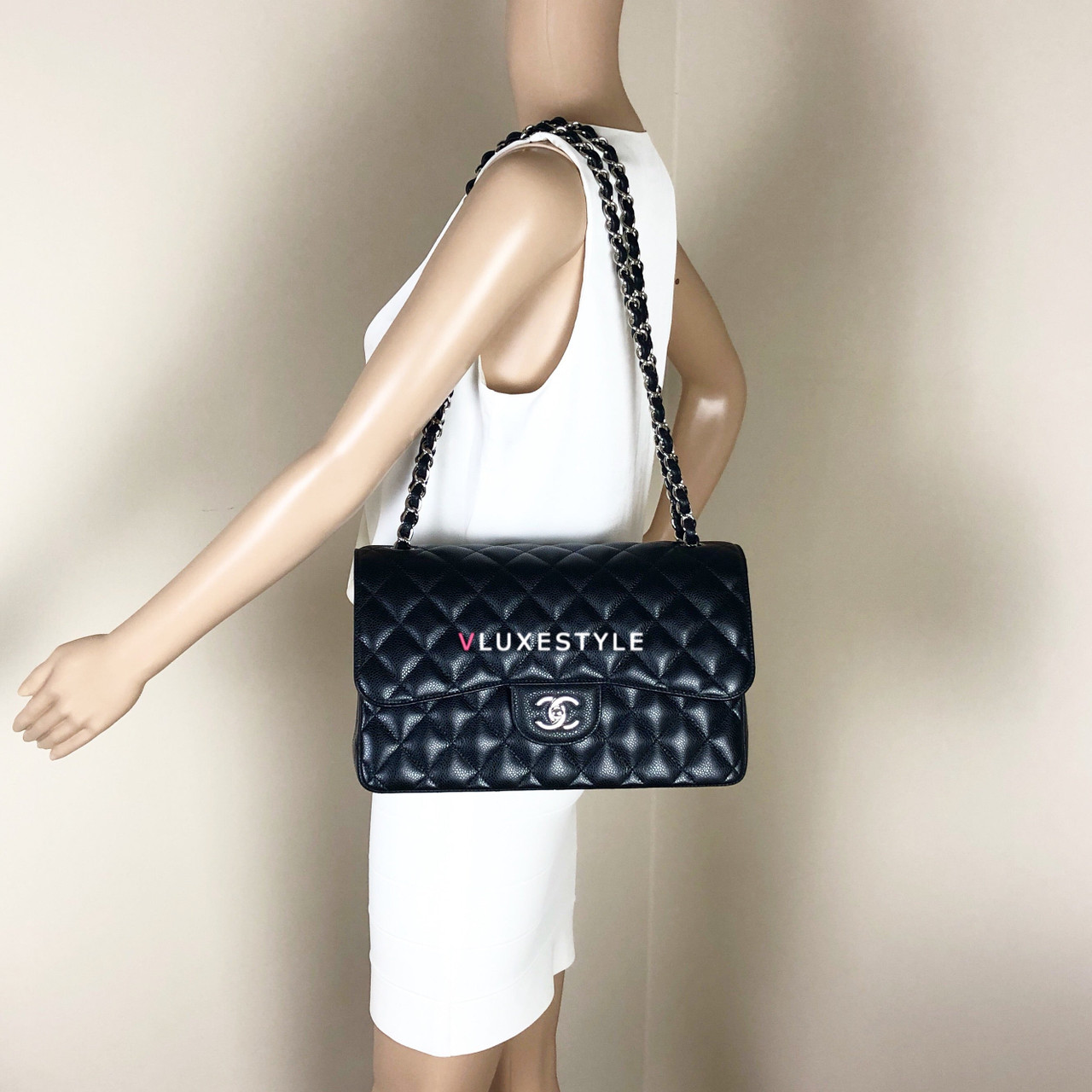 Authentic Chanel Classic Jumbo Black Quilted Caviar Double Flap with silver hardware. This timeless and stylish shoulder bag is crafted of luxurious and durable caviar leather in black and silver hardware. The bag can be worn over-the-shoulder. It is essentially a timeless piece that exudes elegance, it’s the perfect bag for every occasion.