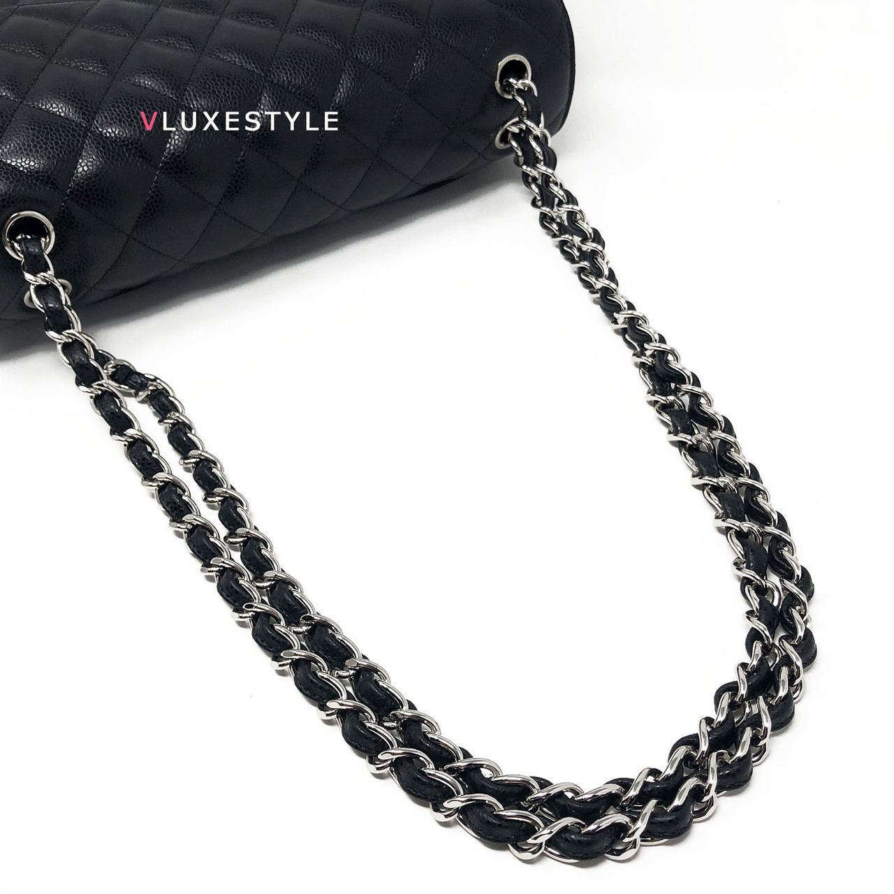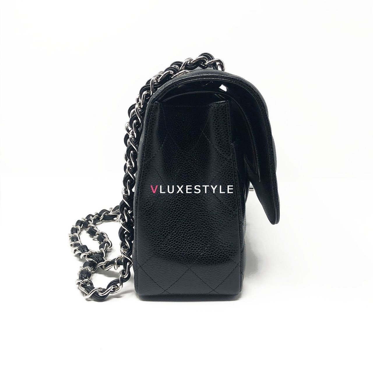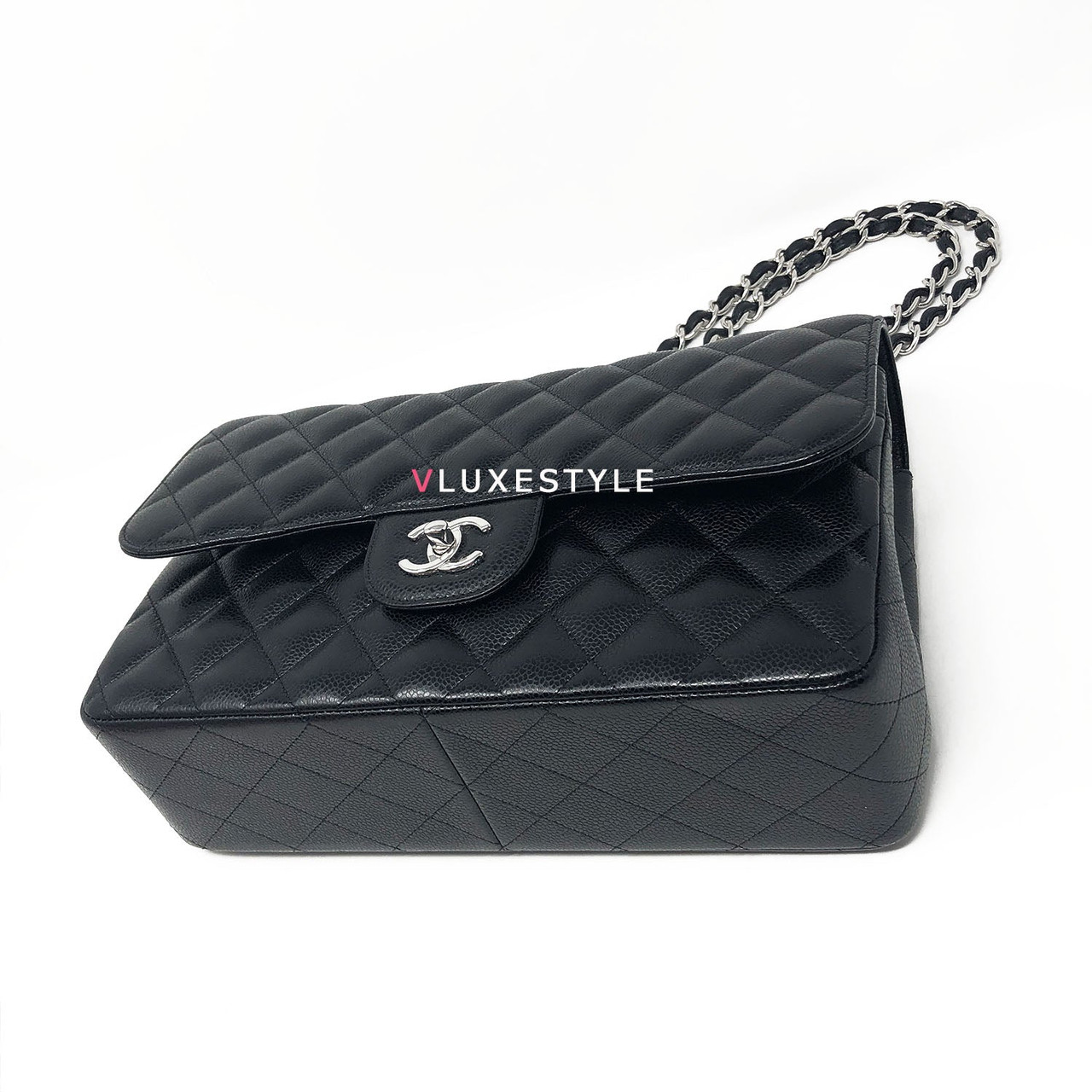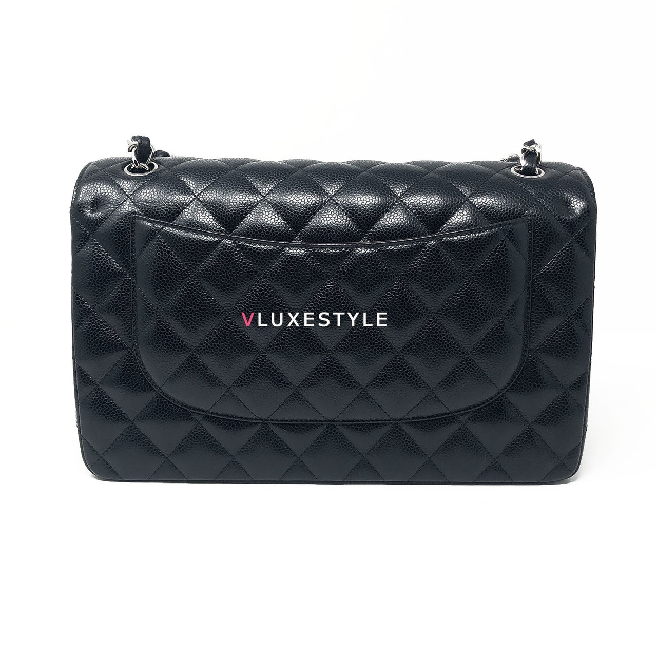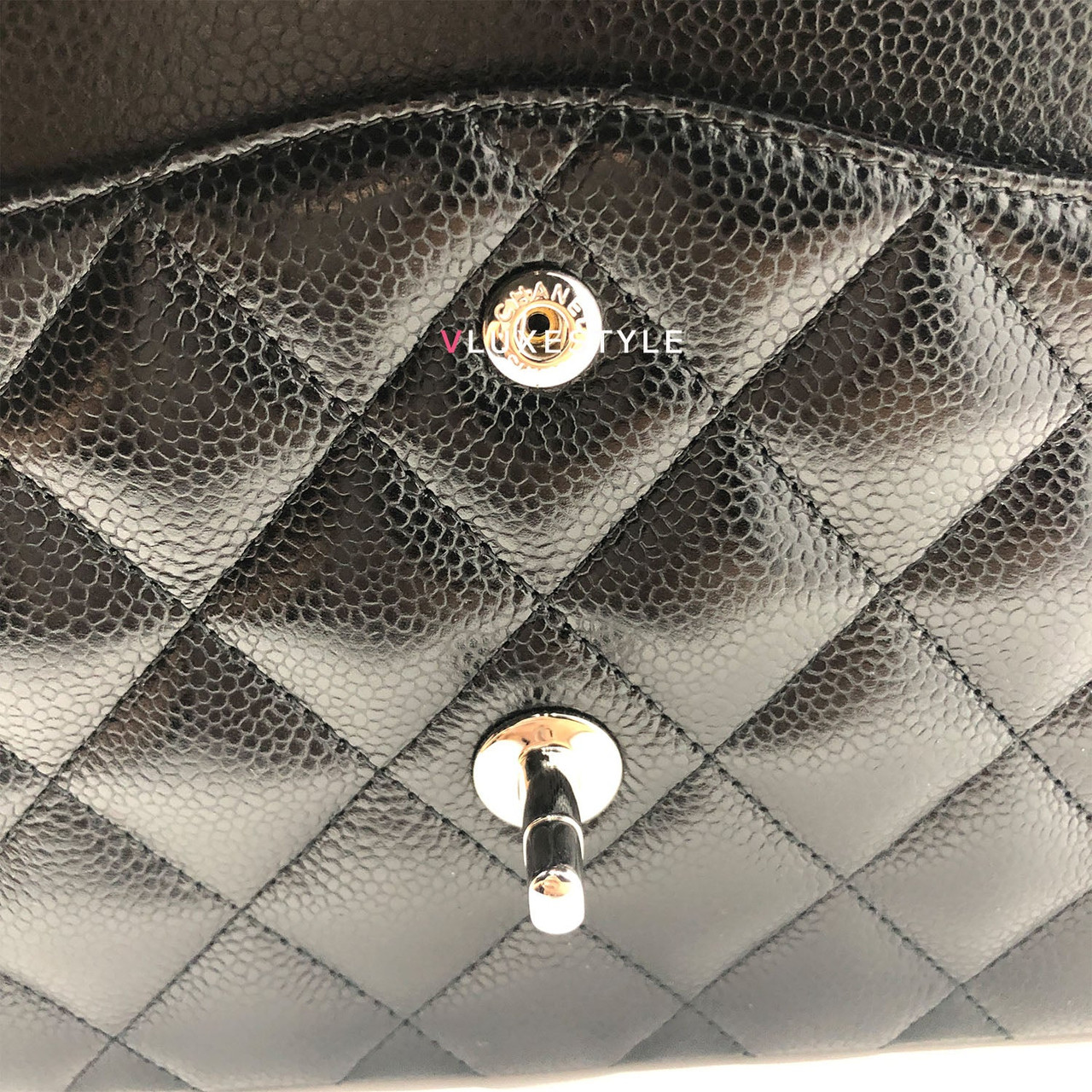 Authentic Chanel Classic Jumbo Black Quilted Caviar Double Flap with silver hardware. This timeless and stylish shoulder bag is crafted of luxurious and durable caviar leather in black and silver hardware. The bag can be worn over-the-shoulder. It is essentially a timeless piece that exudes elegance, it’s the perfect bag for every occasion.