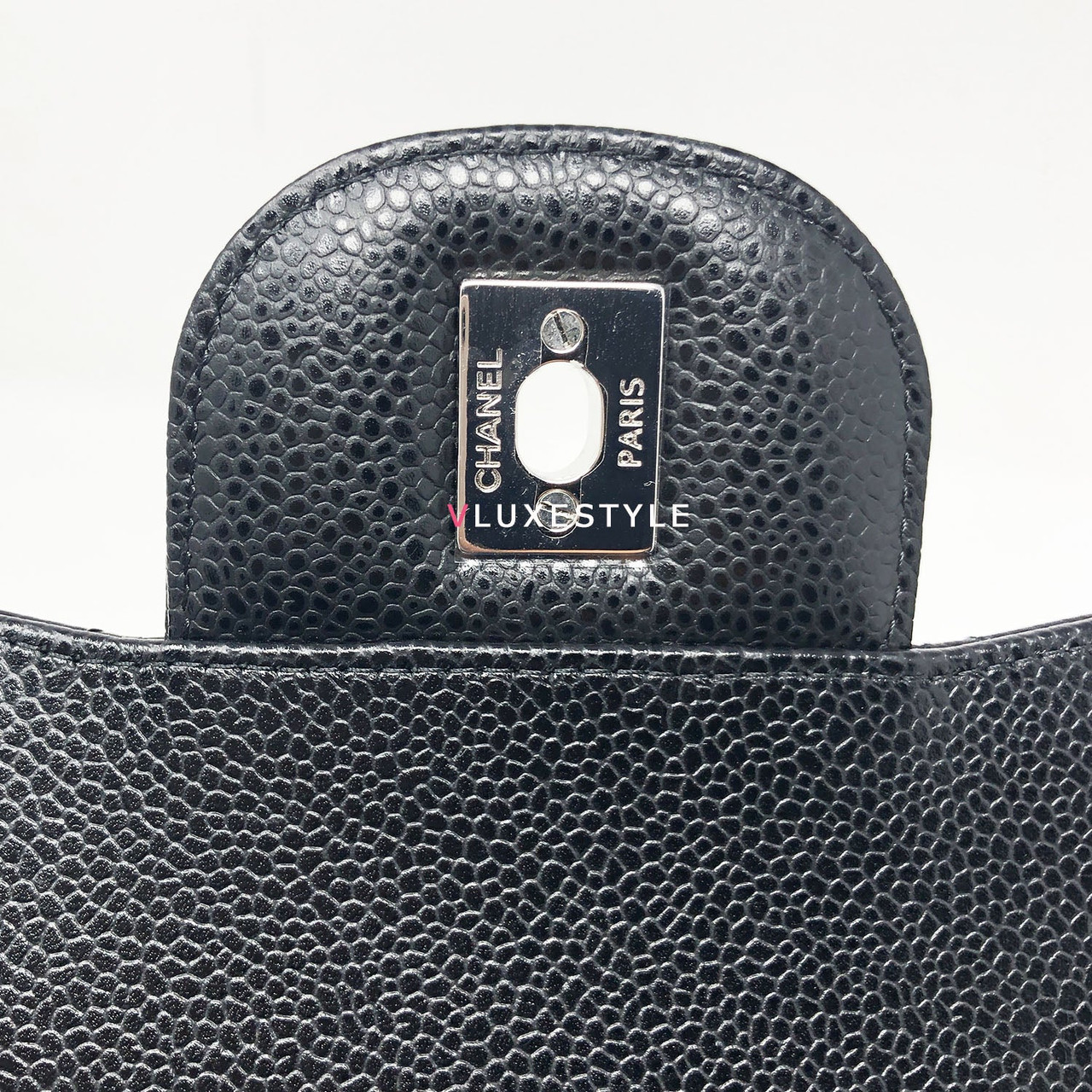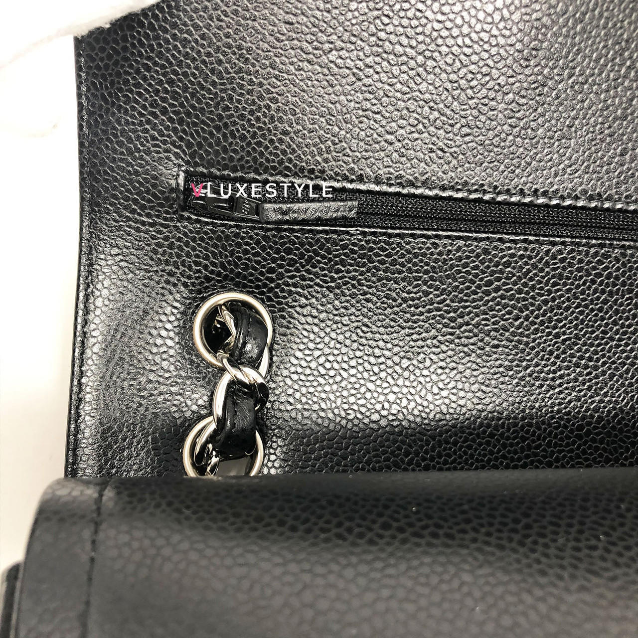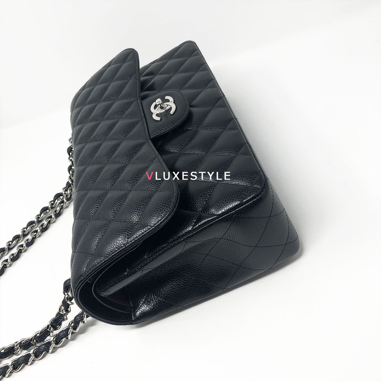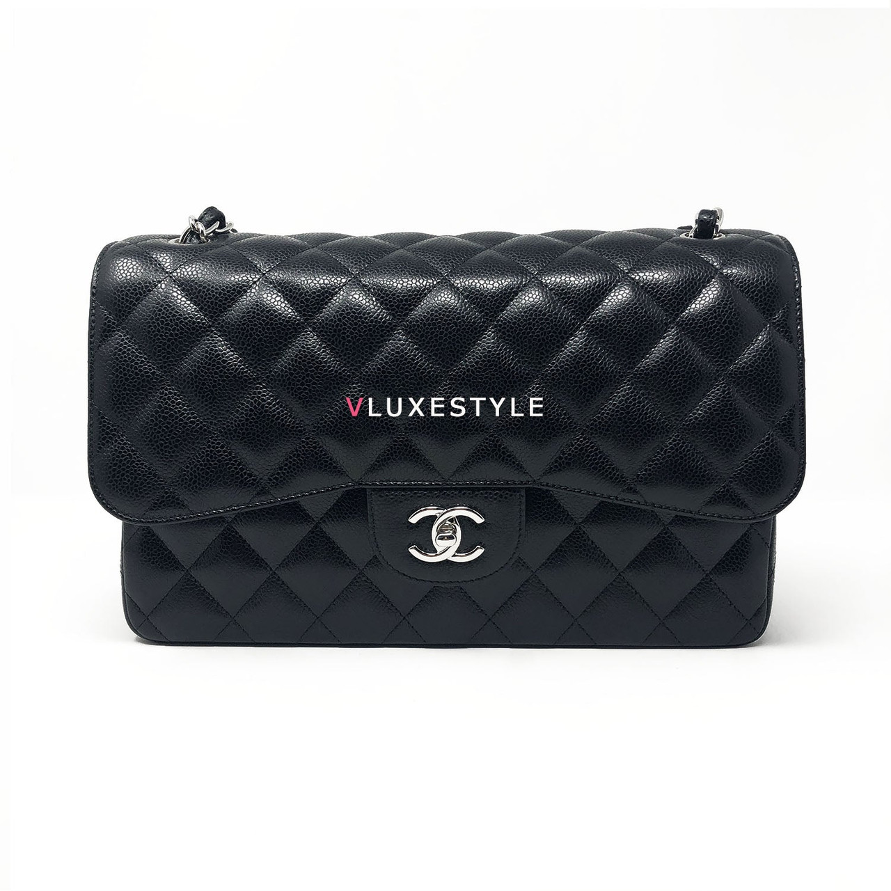 Authentic Chanel Classic Jumbo Black Quilted Caviar Double Flap with silver hardware. This timeless and stylish shoulder bag is crafted of luxurious and durable caviar leather in black and silver hardware. The bag can be worn over-the-shoulder. It is essentially a timeless piece that exudes elegance, it’s the perfect bag for every occasion.
