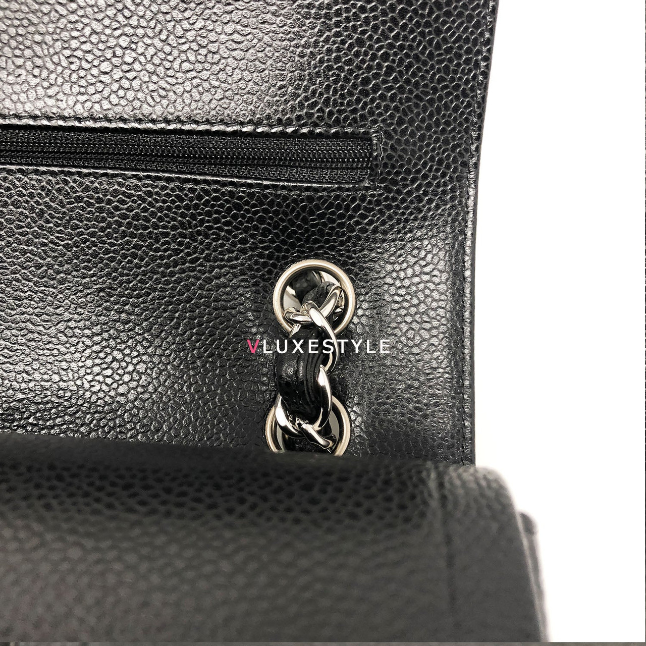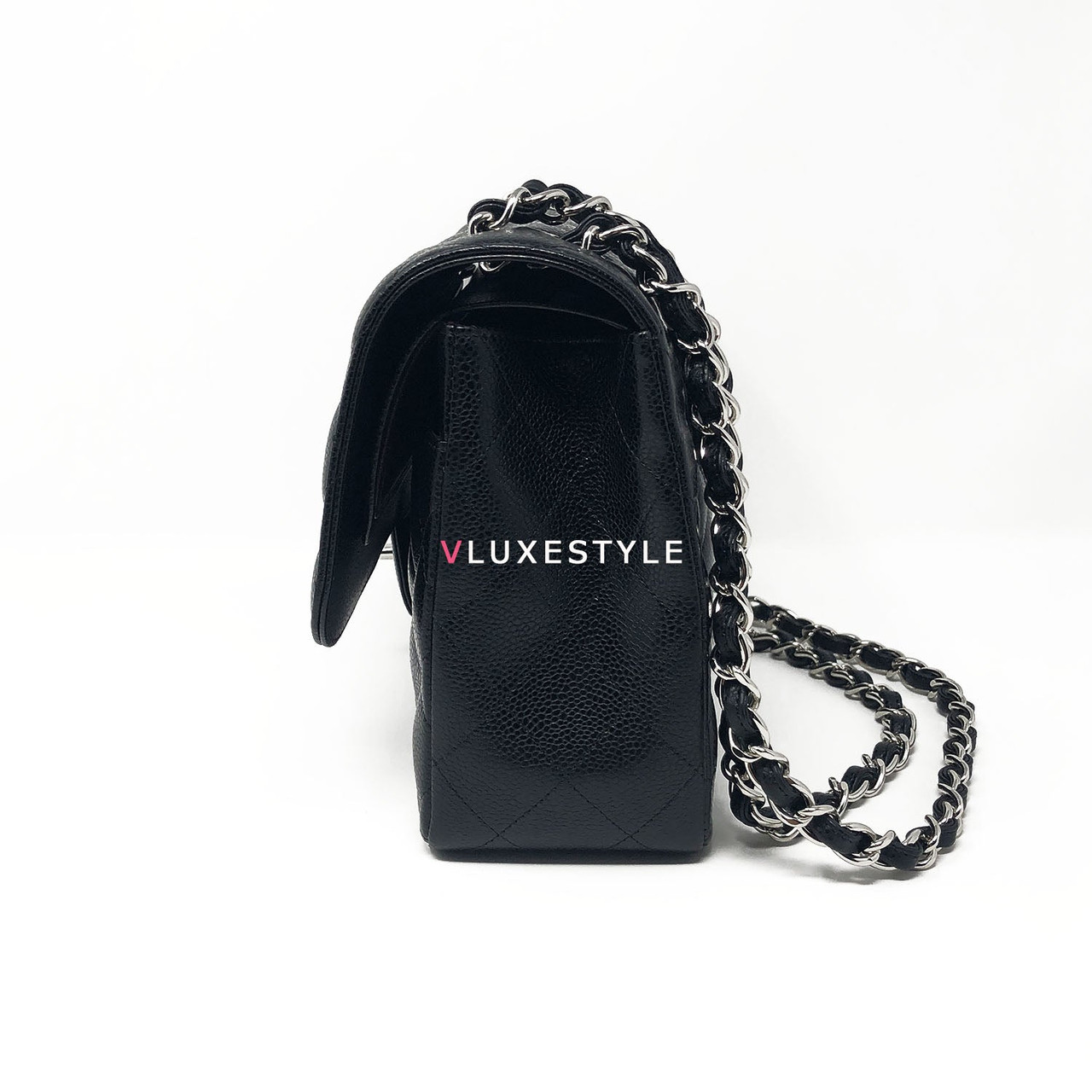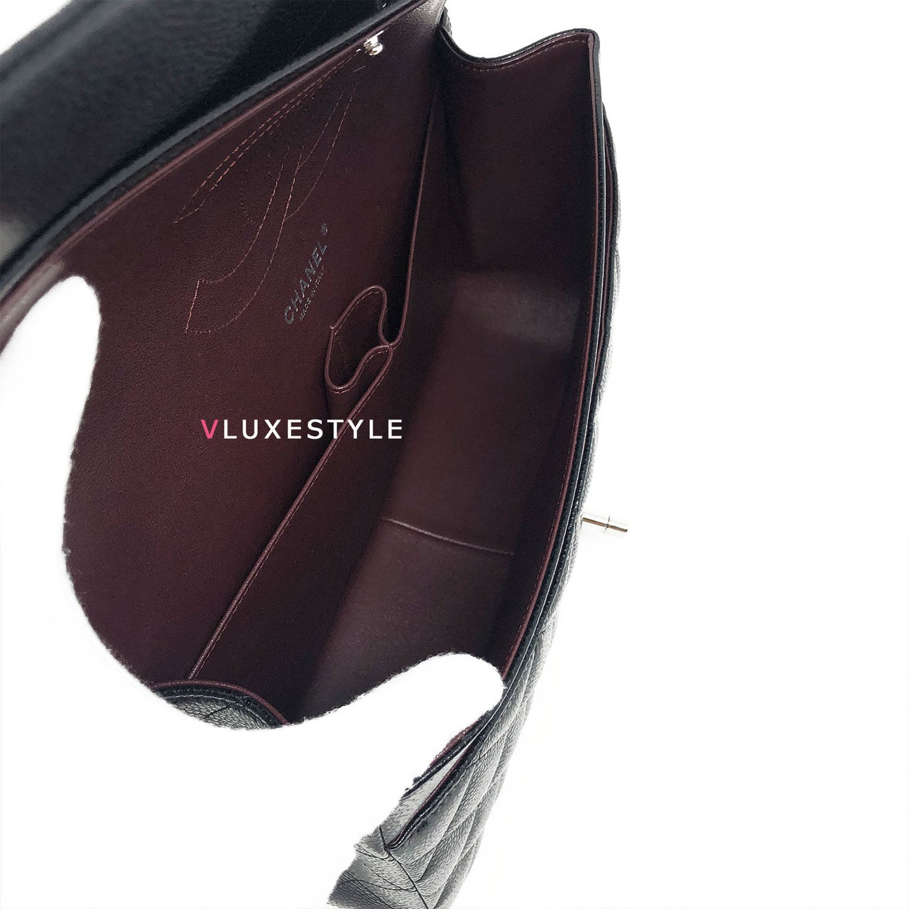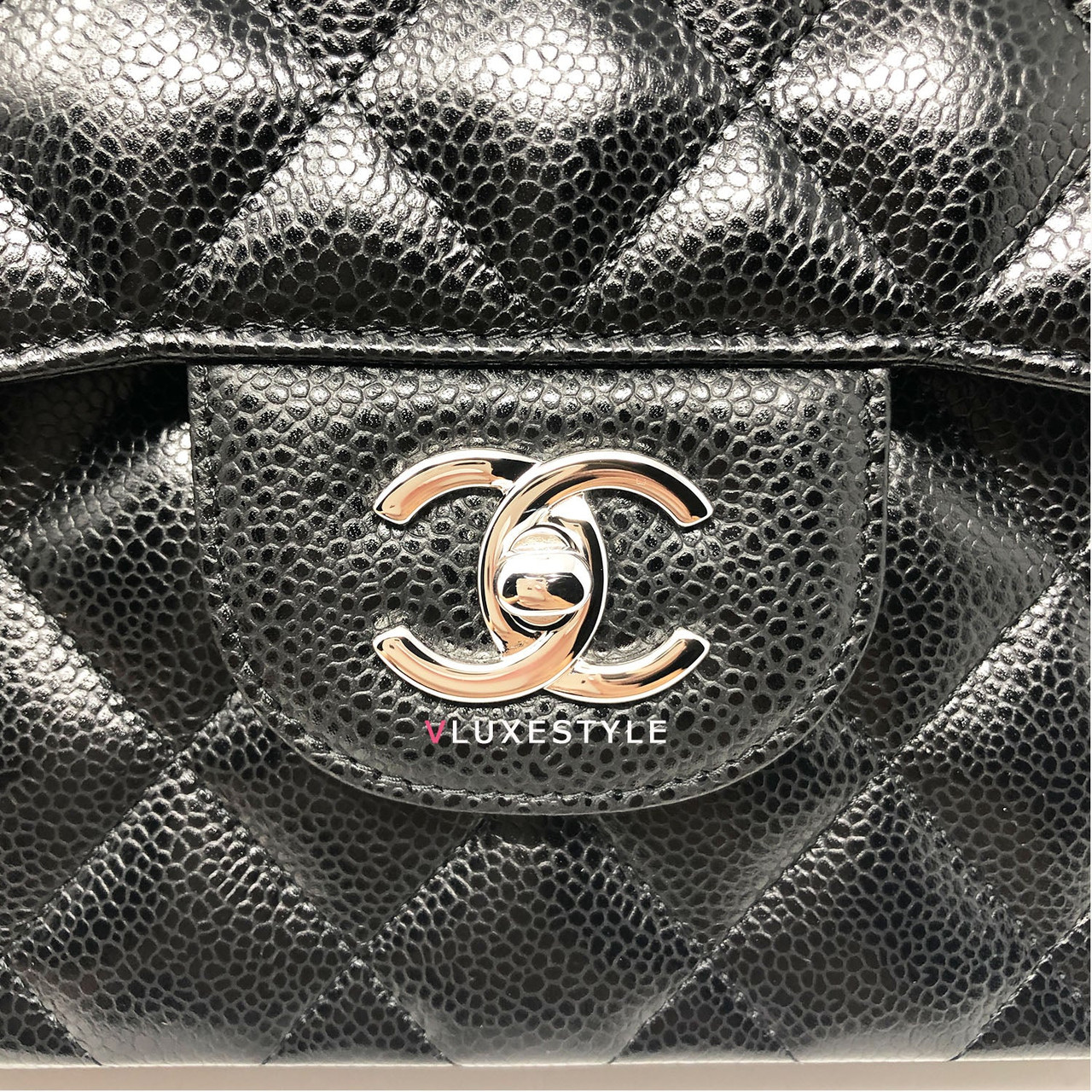 Authentic Chanel Classic Jumbo Black Quilted Caviar Double Flap with silver hardware. This timeless and stylish shoulder bag is crafted of luxurious and durable caviar leather in black and silver hardware. The bag can be worn over-the-shoulder. It is essentially a timeless piece that exudes elegance, it’s the perfect bag for every occasion.