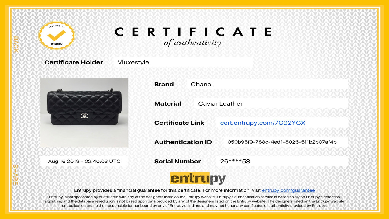 Comes with: Complete set, authenticity card, dust bag, care booklet, camellia, lace and Chanel magnetic box with additional Entrupy Authenticity Certificate