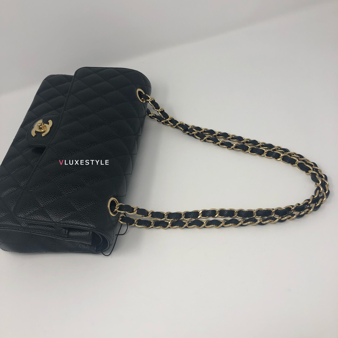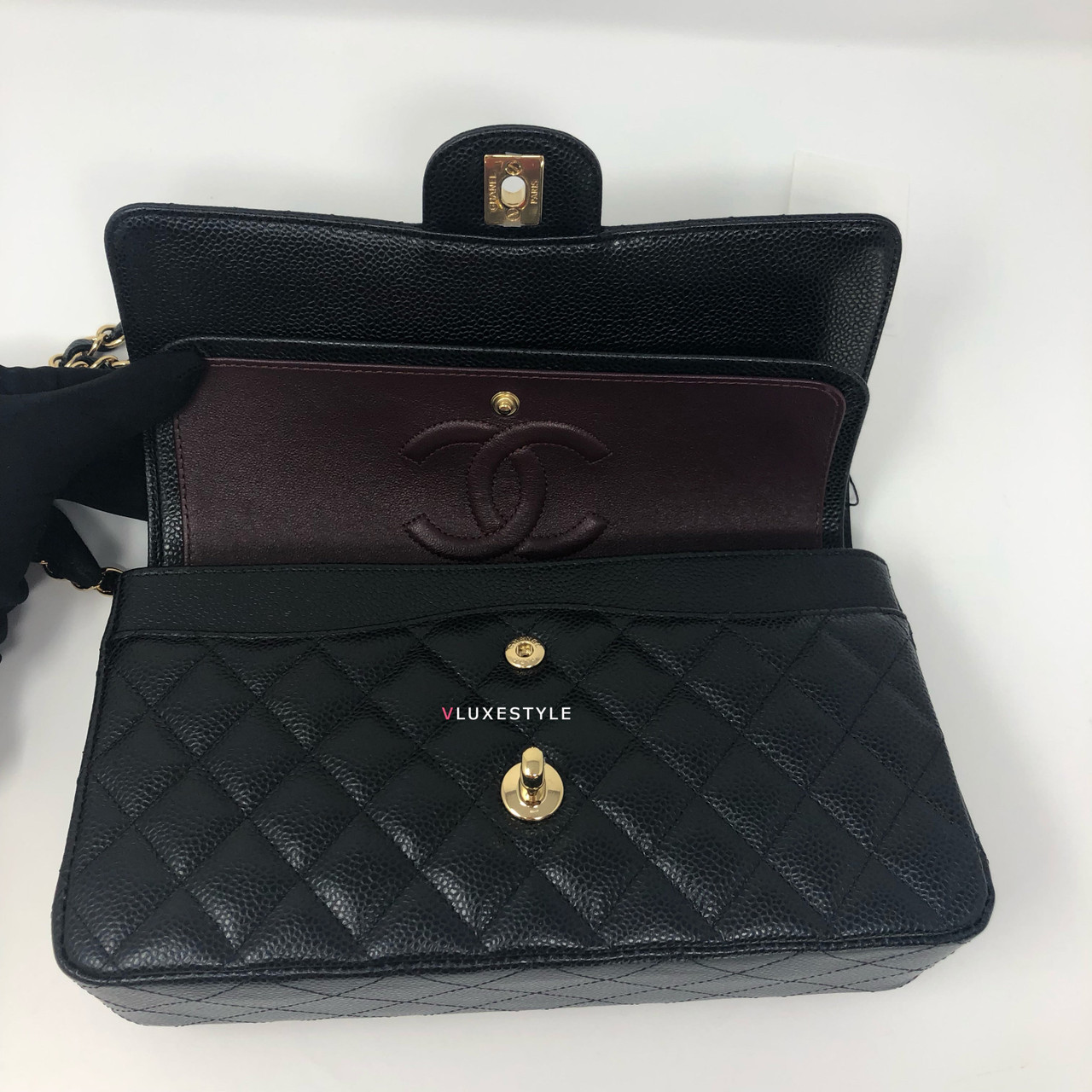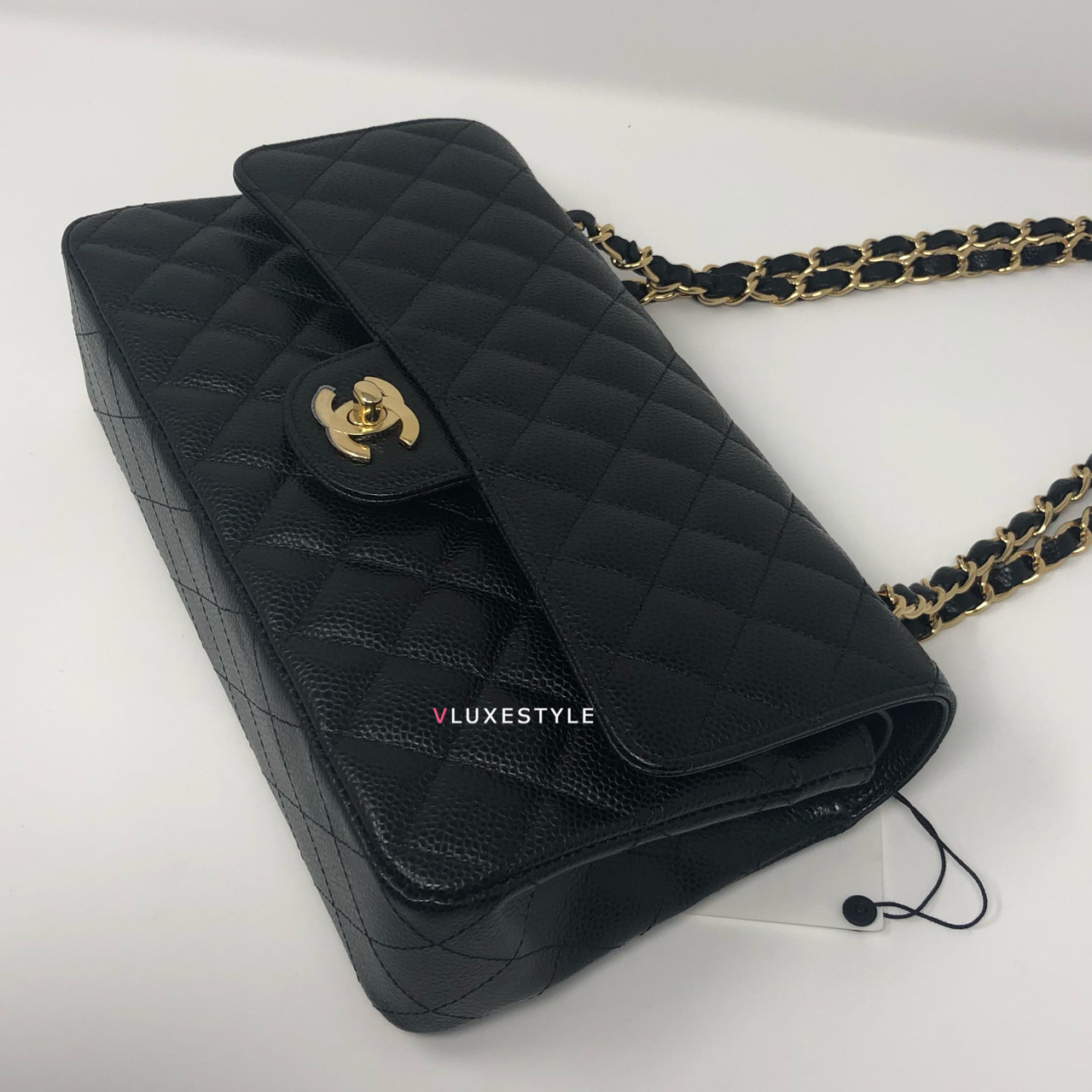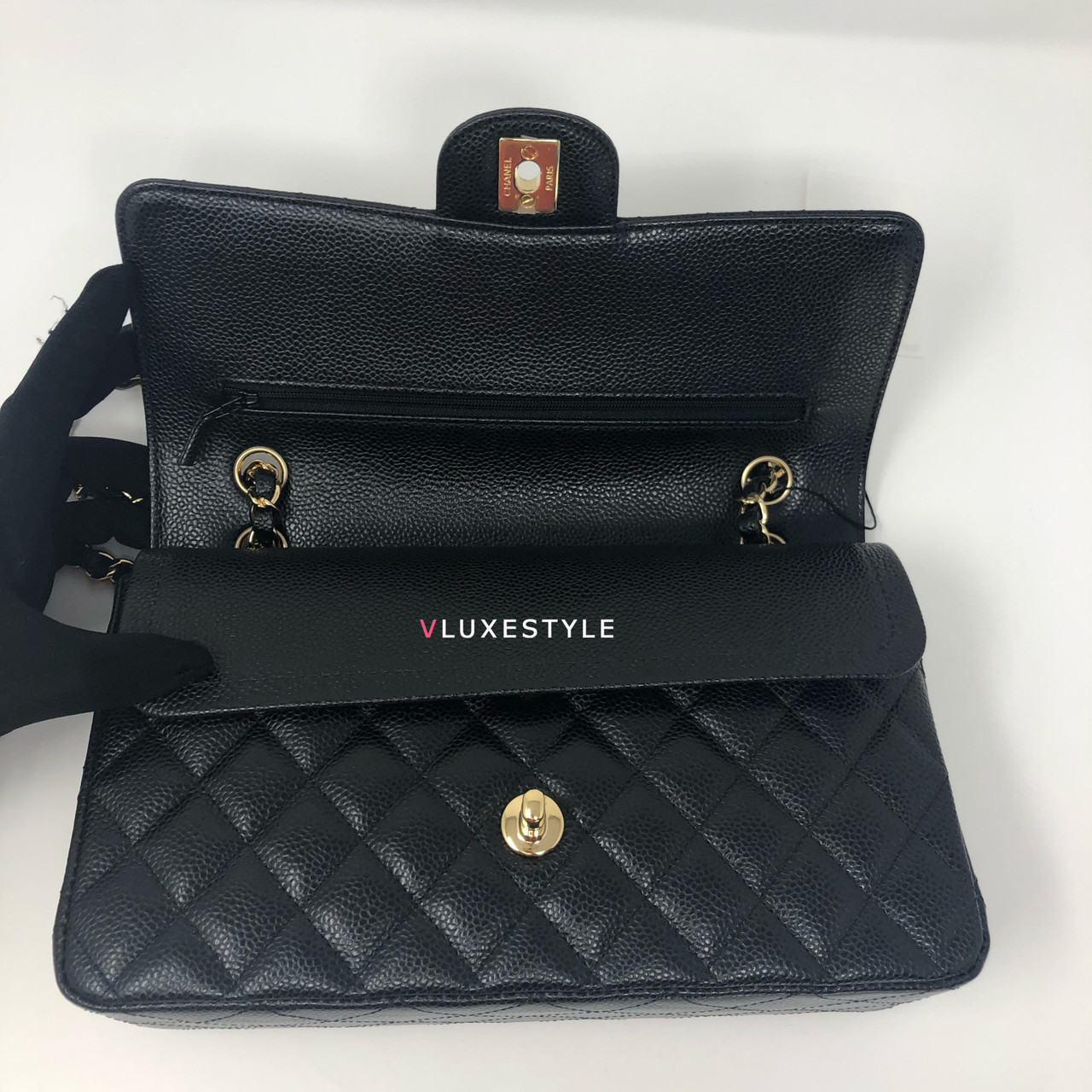 Brand new with tags and receipt! Classic Black Medium Caviar with gold hardware. Made in France/25 series/2018. The bag comes full set, authenticity card, receipt dust bag, box, care booklet, felt, camelia and lace with additional third-party Entrupy Authenticity Certificate.