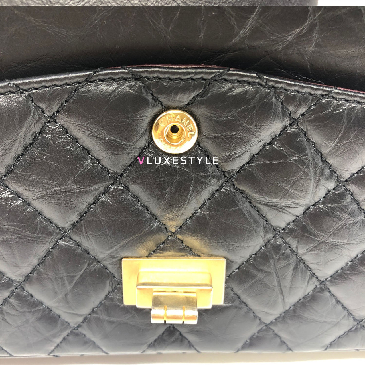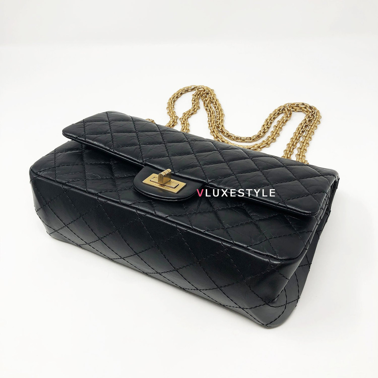 Highly sought-after and difficult to find this size and combo. Authentic Chanel Reissue 2.55 Black Quilted Aged Calfskin Double Flap with aged gold hardware in size 225. This stylish shoulder bag is crafted of luxurious and durable quilted aged calfskin leather in black. The bag features a mademoiselle turn lock closure and bijoux aged gold hardware shoulder chains. The bag can be worn long and short over-the-shoulder or wear it as a cross-body. An elegant, understated, timeless piece perfect for every occasion.