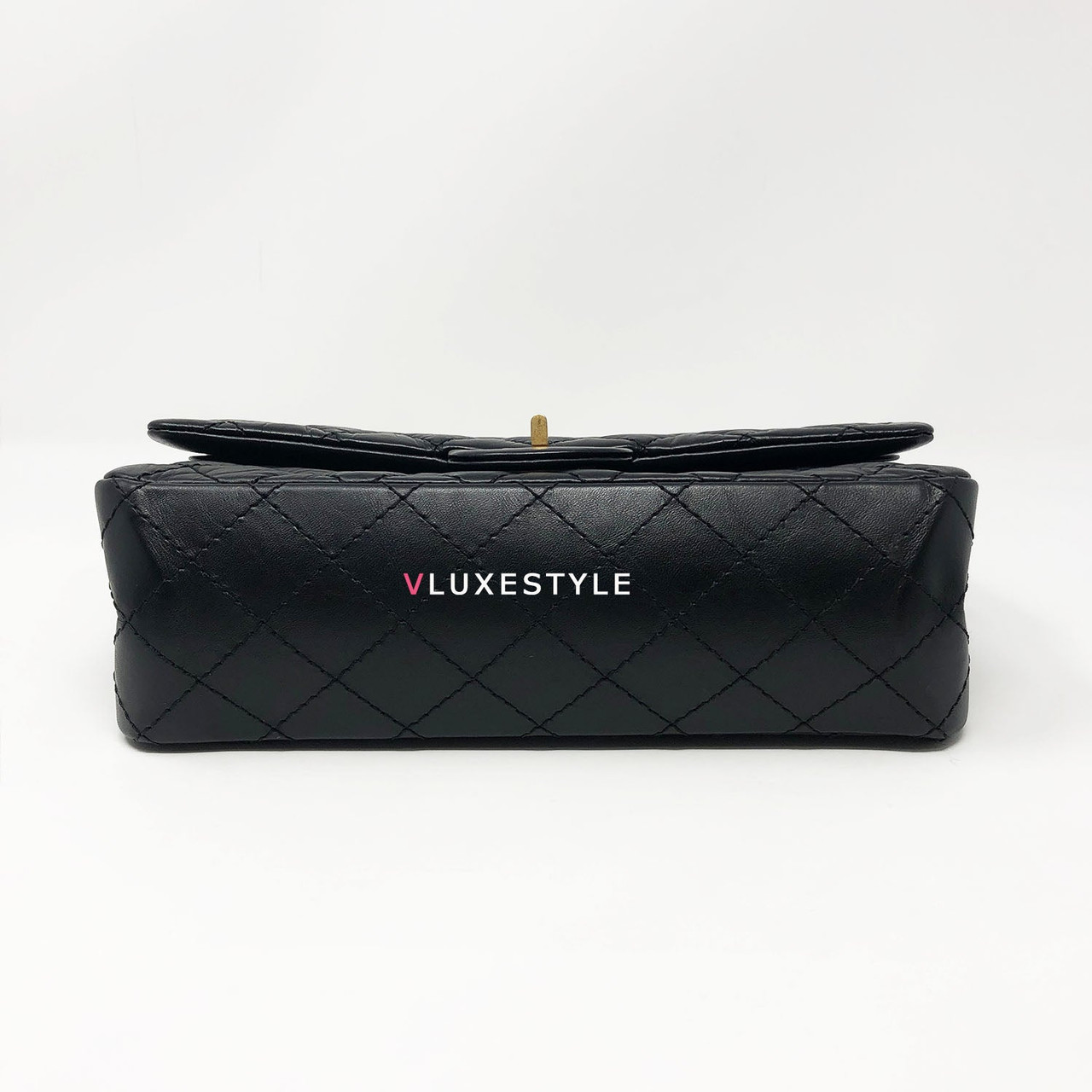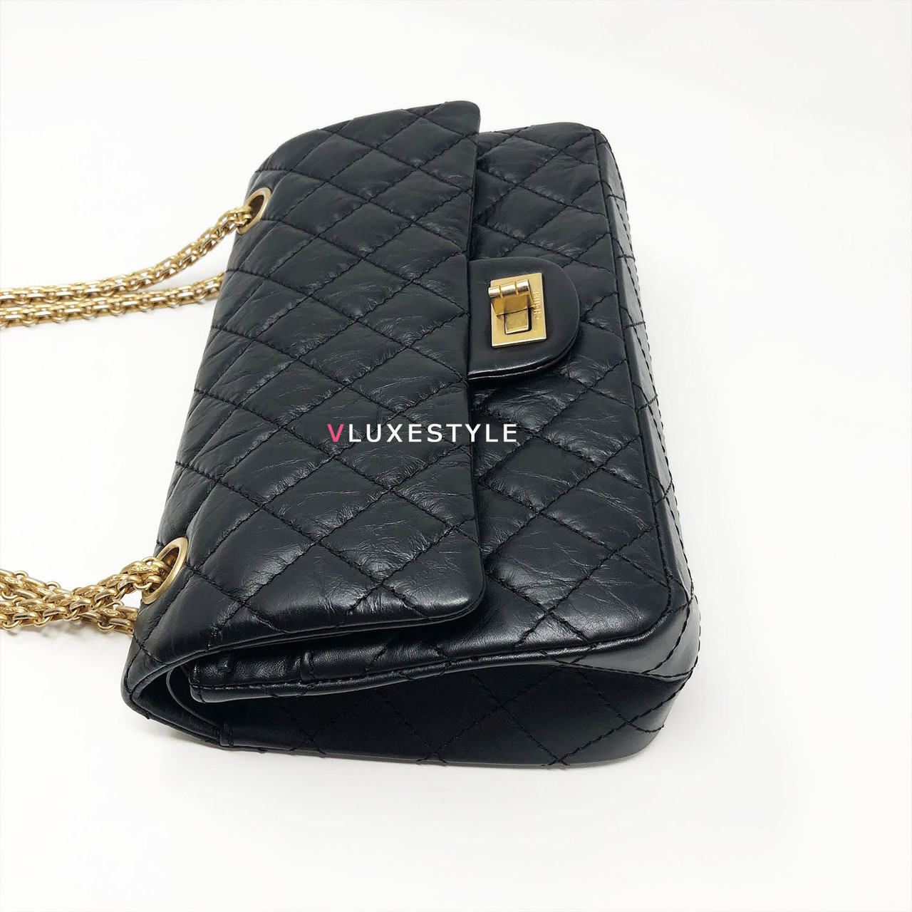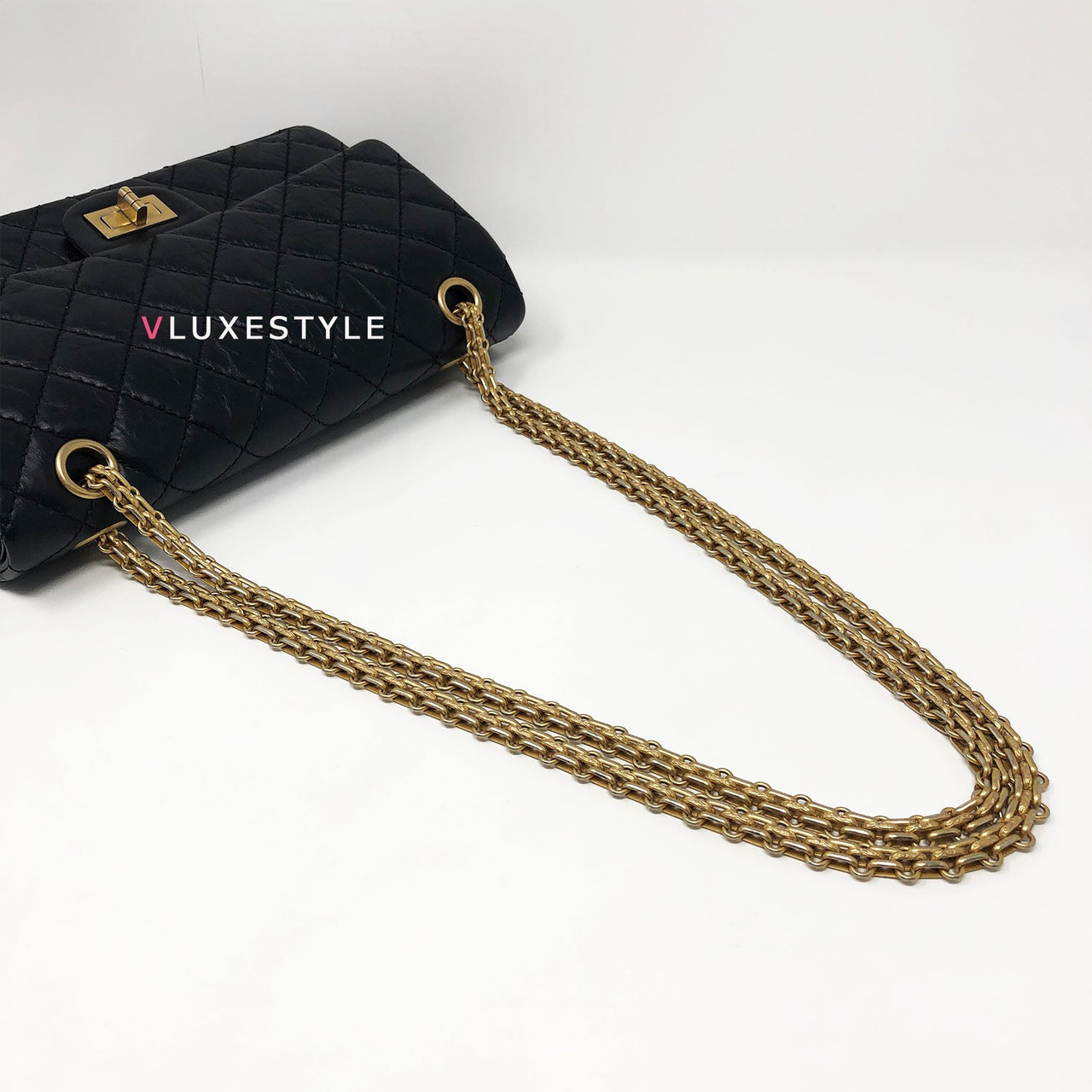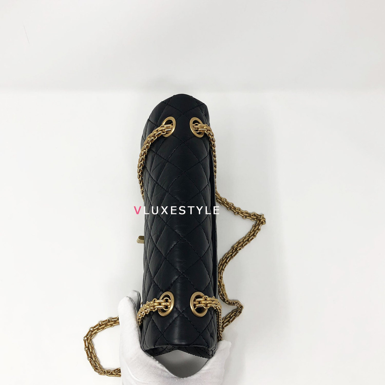 Highly sought-after and difficult to find this size and combo. Authentic Chanel Reissue 2.55 Black Quilted Aged Calfskin Double Flap with aged gold hardware in size 225. This stylish shoulder bag is crafted of luxurious and durable quilted aged calfskin leather in black. The bag features a mademoiselle turn lock closure and bijoux aged gold hardware shoulder chains. The bag can be worn long and short over-the-shoulder or wear it as a cross-body. An elegant, understated, timeless piece perfect for every occasion.