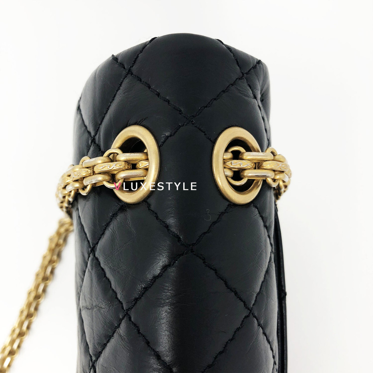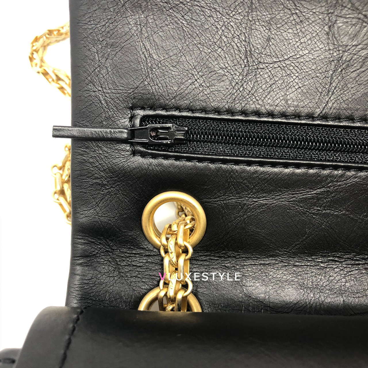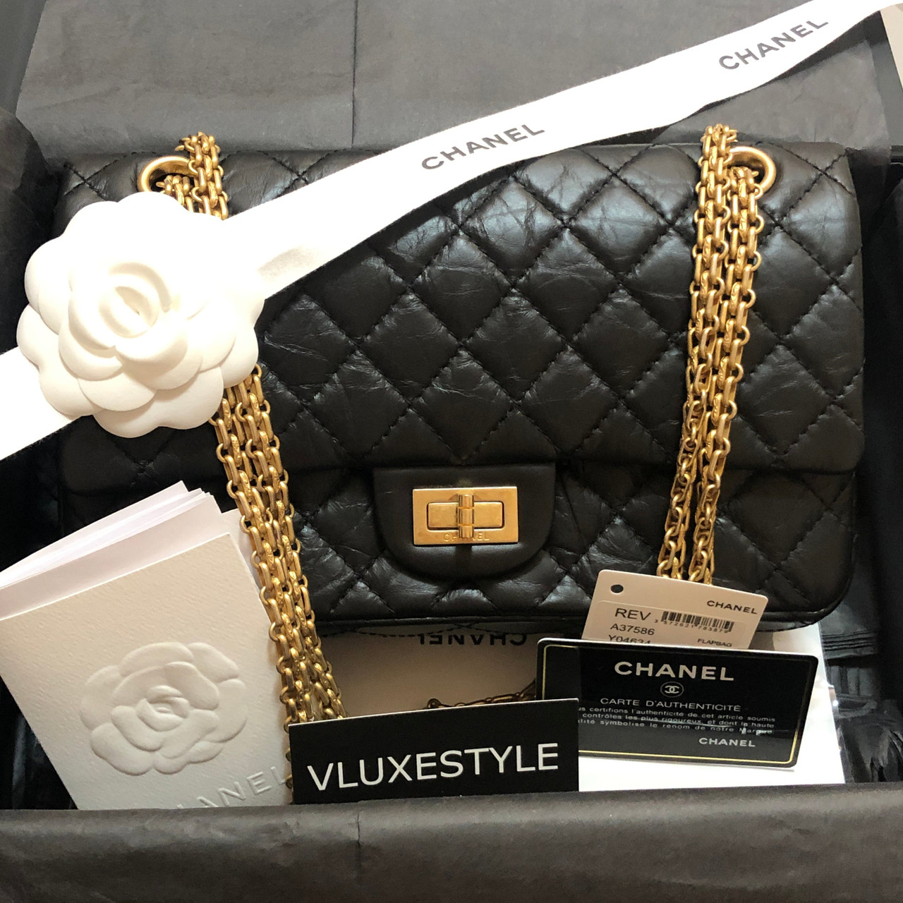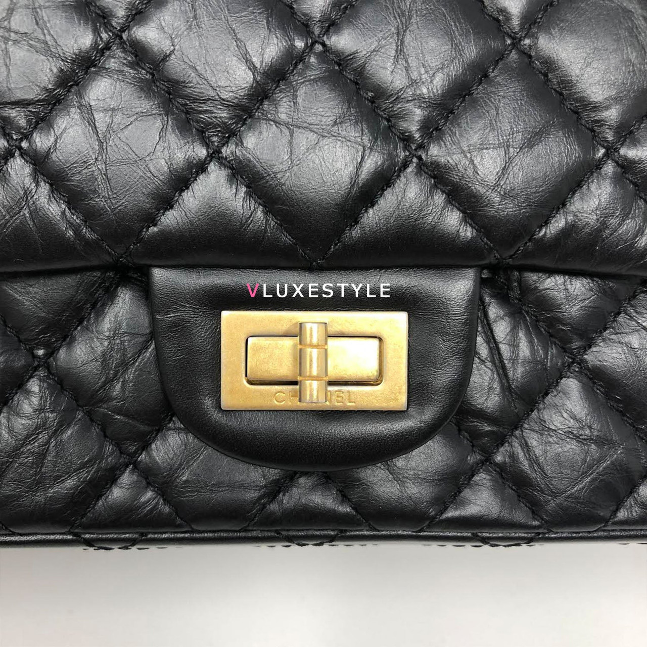 Highly sought-after and difficult to find this size and combo. Authentic Chanel Reissue 2.55 Black Quilted Aged Calfskin Double Flap with aged gold hardware in size 225. This stylish shoulder bag is crafted of luxurious and durable quilted aged calfskin leather in black. The bag features a mademoiselle turn lock closure and bijoux aged gold hardware shoulder chains. The bag can be worn long and short over-the-shoulder or wear it as a cross-body. An elegant, understated, timeless piece perfect for every occasion.