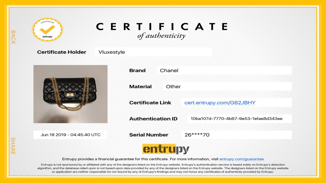 Comes with: Full set, tags, authenticity card, copy of the receipt, dust bag, care booklet, felt, Chanel box, with additional third-party Entrupy Authenticity Certificate.