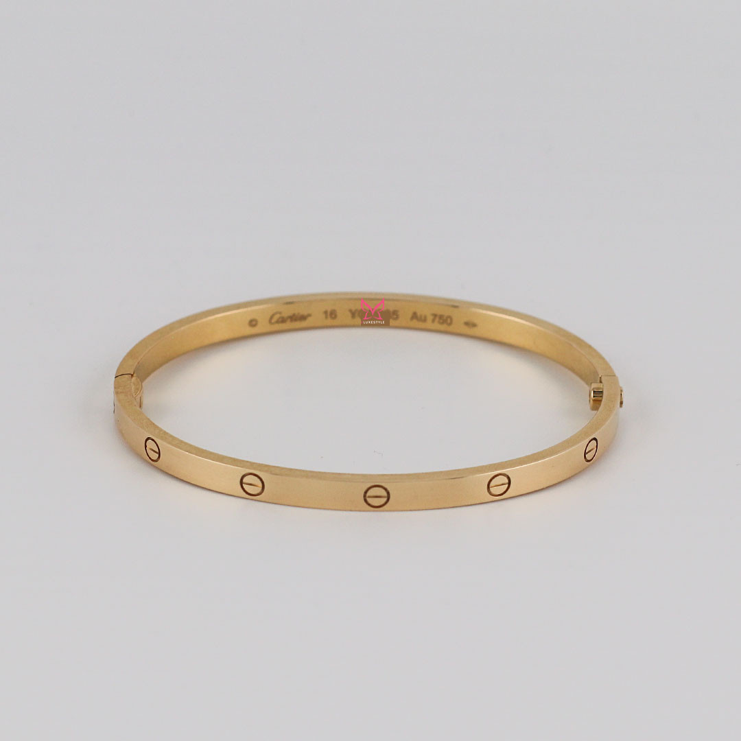 The Cartier 18K Yellow Gold Love Small Bracelet is a stunning piece of jewelry with timeless elegance and luxury that Cartier is known for. Crafted from 18K yellow gold, this bracelet is a true symbol of love and luxury.