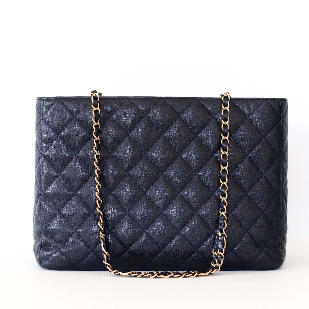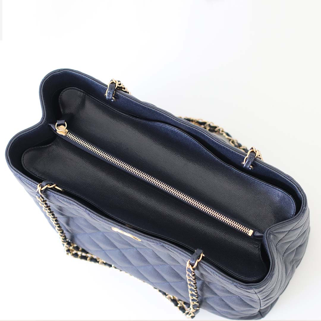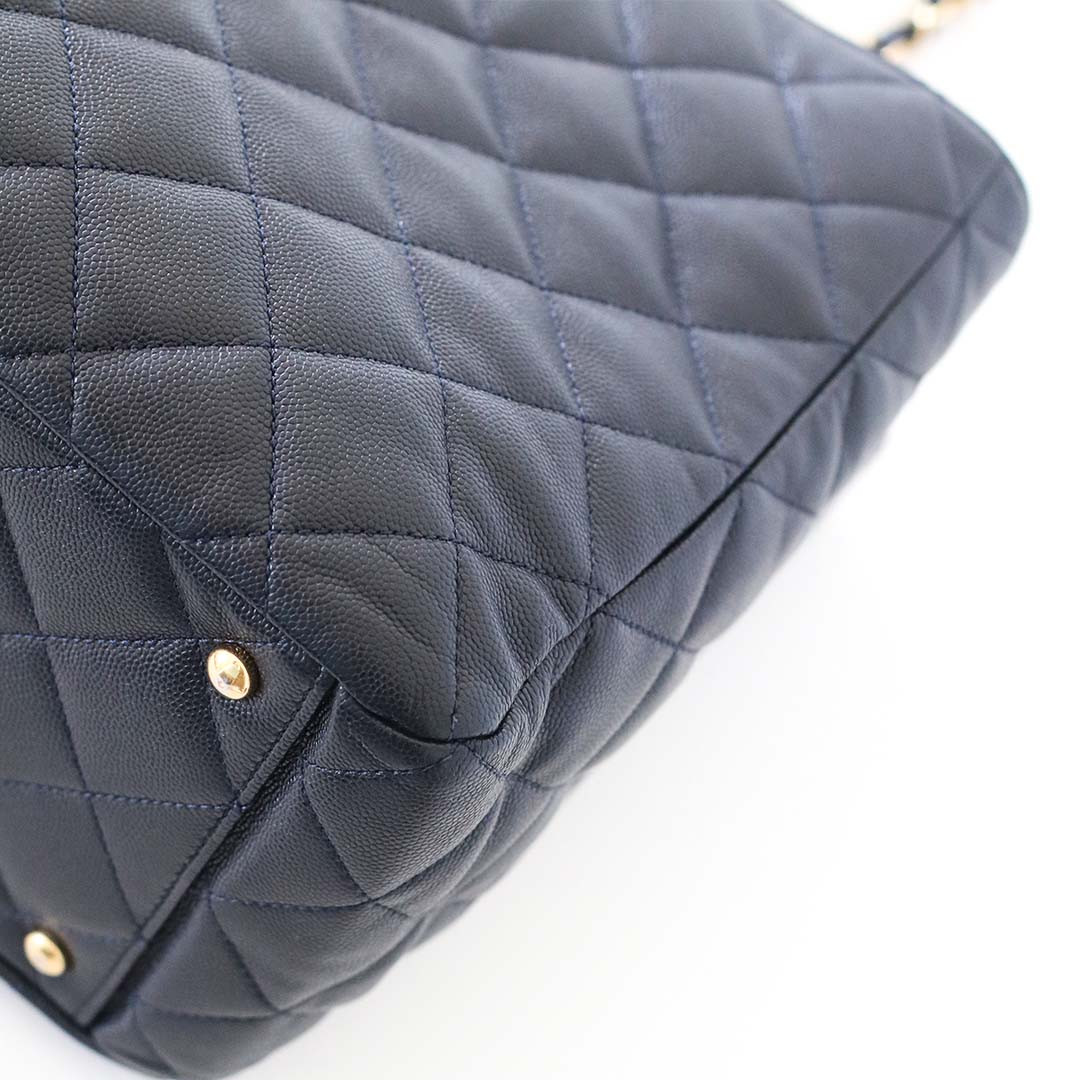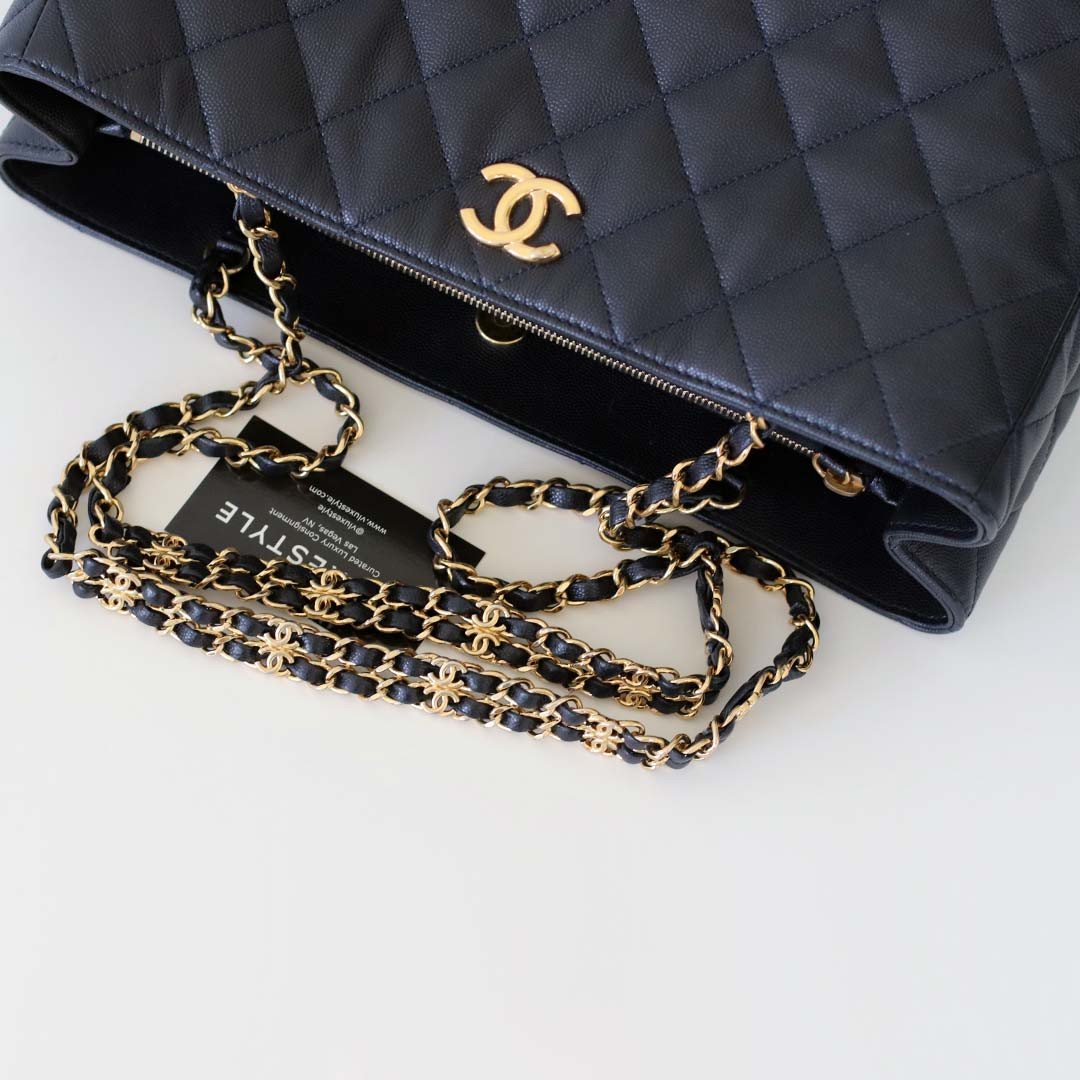 The Timeless Tote 22K in Navy Quilted Caviar is an exquisite piece from Chanel that seamlessly combines elegance and functionality—crafted from diamond-quilted calfskin caviar leather in an elegant navy color, complemented by luxurious brushed gold hardware. The tote features a unique leather-threaded, brushed gold chain-link strap with chic chain details. It features the iconic Chanel CC logo on the front. This tote is not only a statement piece but also a versatile accessory for your daily essentials.