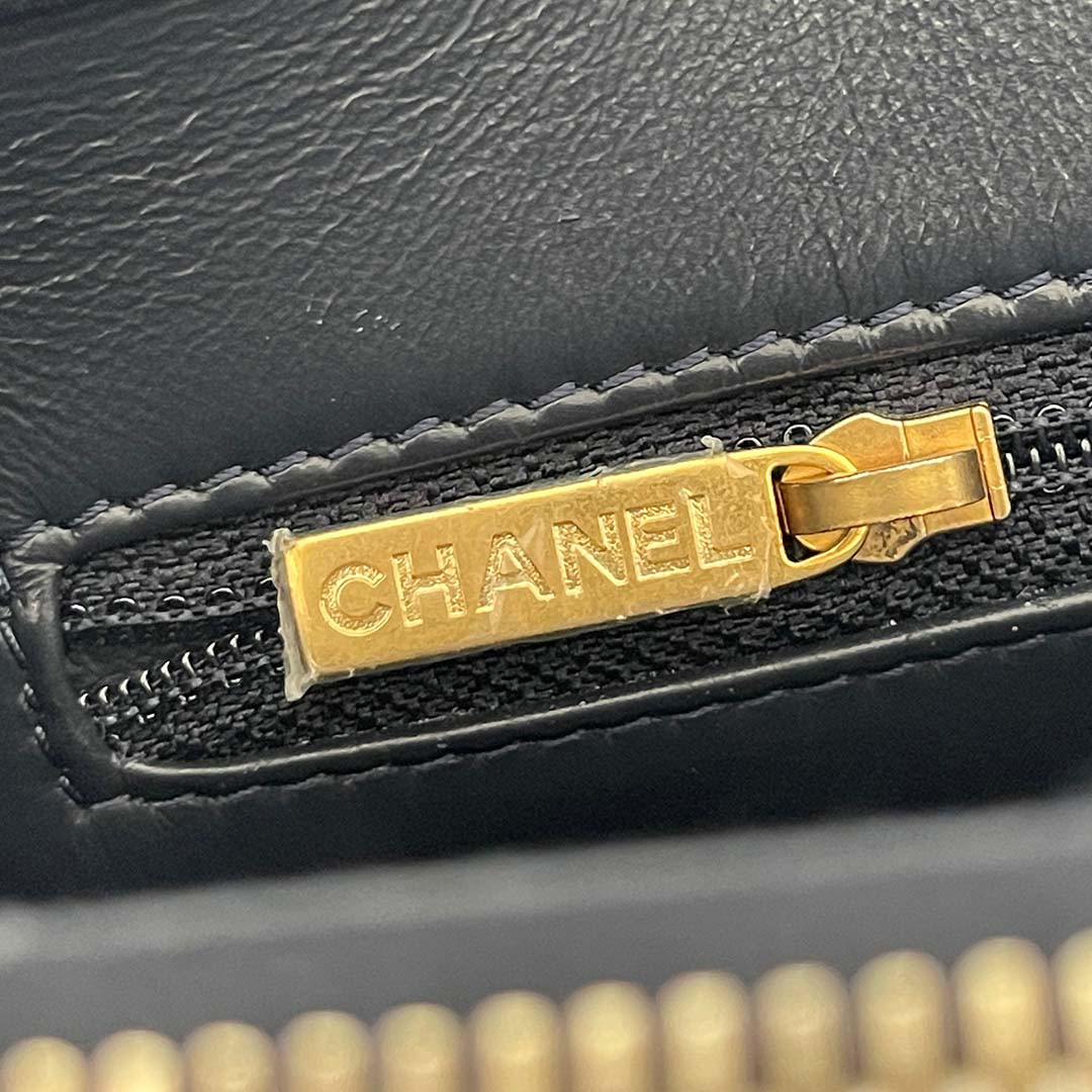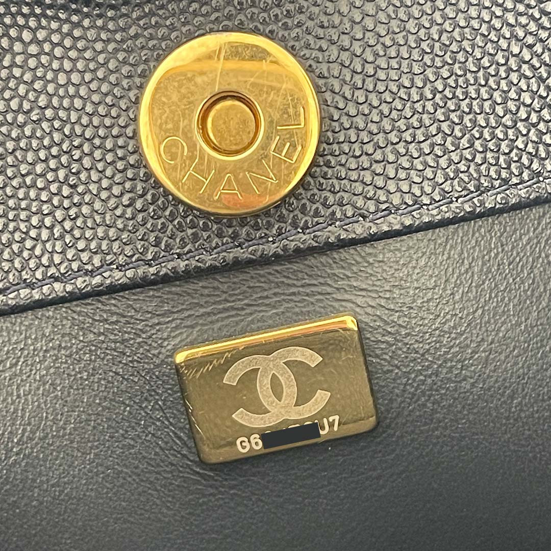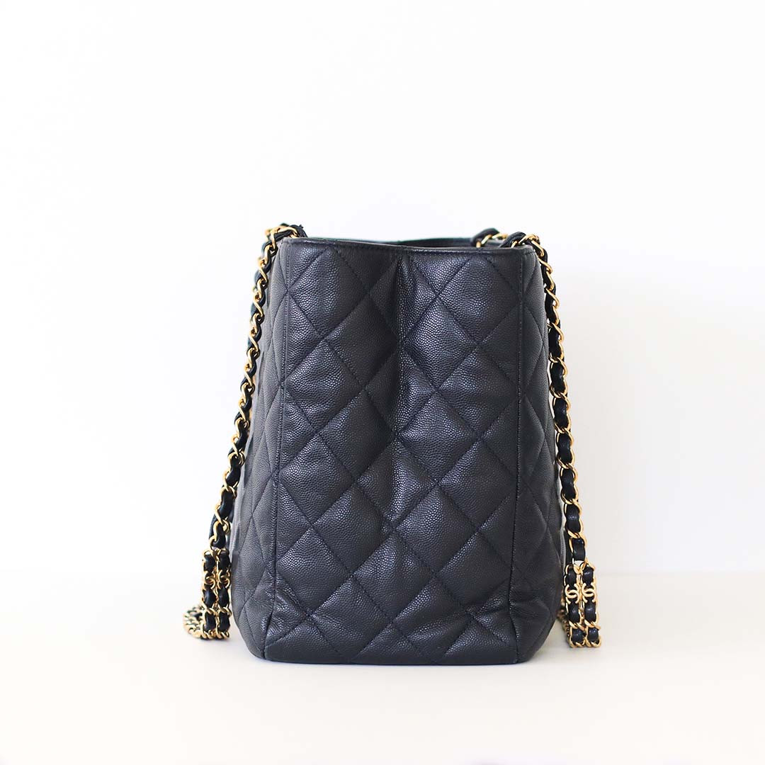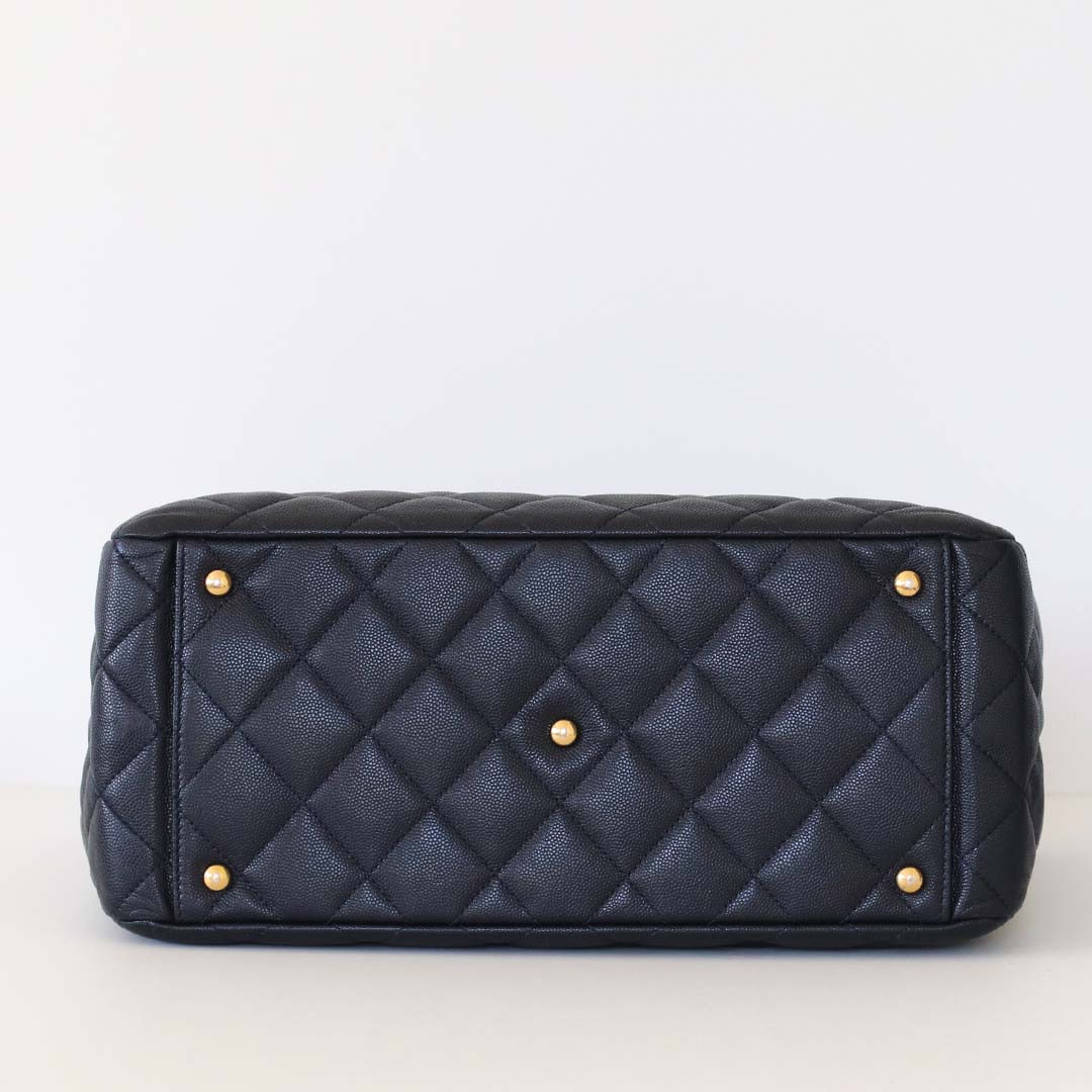 The Timeless Tote 22K in Navy Quilted Caviar is an exquisite piece from Chanel that seamlessly combines elegance and functionality—crafted from diamond-quilted calfskin caviar leather in an elegant navy color, complemented by luxurious brushed gold hardware. The tote features a unique leather-threaded, brushed gold chain-link strap with chic chain details. It features the iconic Chanel CC logo on the front. This tote is not only a statement piece but also a versatile accessory for your daily essentials.
