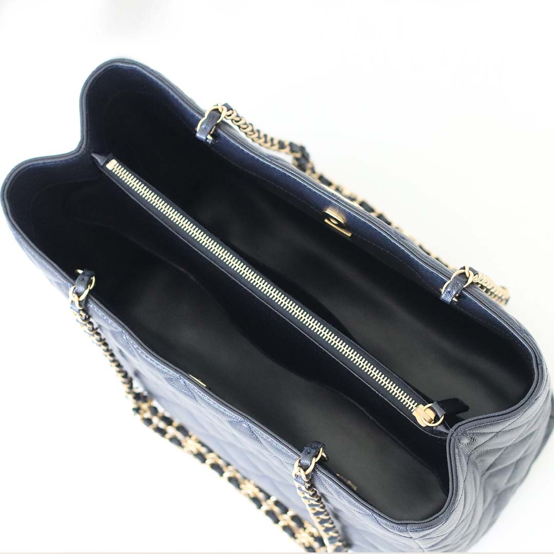 The top of the tote can be left open or securely closed, revealing a partitioned interior lined with blue fabric. It offers functional organization with a central zippered section and additional patch pockets, making it both practical and stylish. Perfect for day-to-evening transitions, this authentic Chanel tote effortlessly combines timeless elegance with practicality.